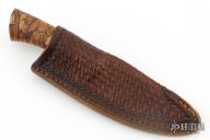 This hunter by Journeyman Smith Pete Crowl features a Damascus blade with notched thumbrest, .234" blade stock and 1.039" blade depth, hidden tang construction. The handle has a stainless steel guard and a spalted wood grip. Comes with a hand tooled brown leather sheath. Excellent condition.