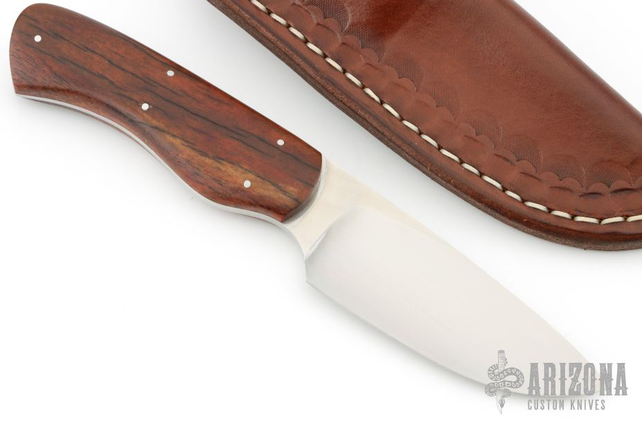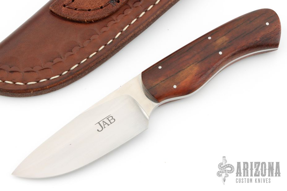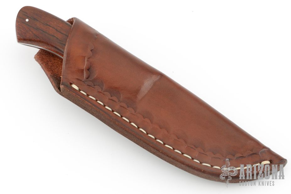This knife by J.A. Basson features a hand rub satin finished drop point blade with .147" blade stock and 1.085" blade depth, full tapered tang construction. The handle features brown bone scales. Comes with a hand tooled brown leather sheath. Excellent condition.