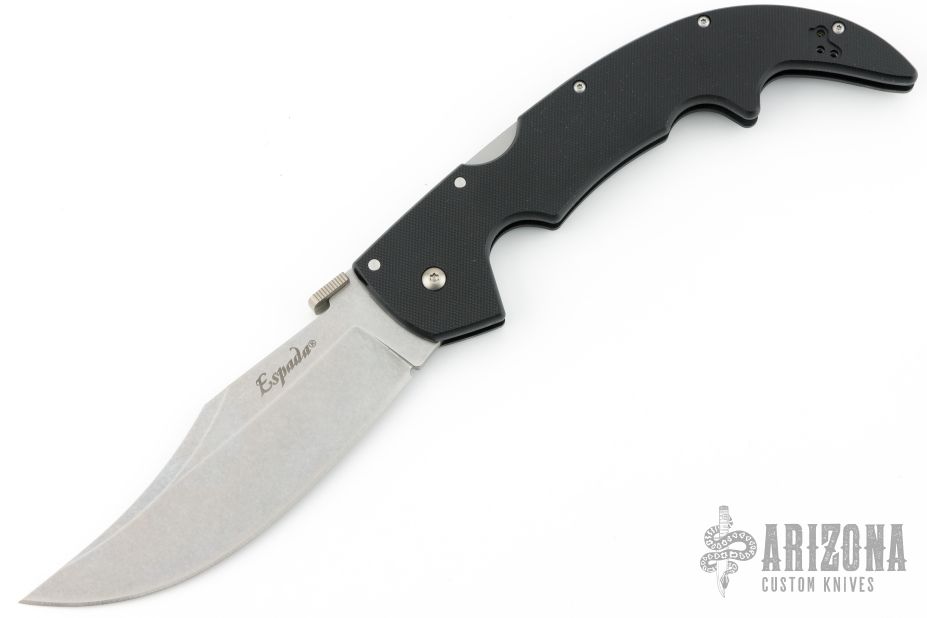 This Espada Lockback Folder has a stone washed upswept blade with thumb disk. Handle is black G10 with black stainless steel lock, black fiber back spacer, and black stainless steel tip up (RH/LH reversible) clip. Comes with original box, and extra clip. New condition.