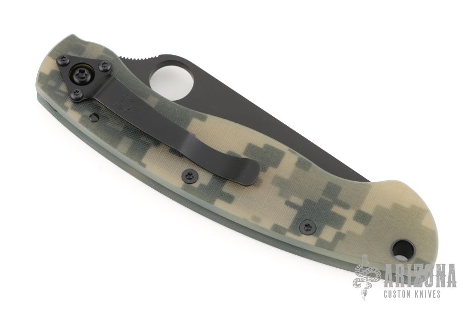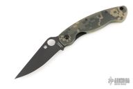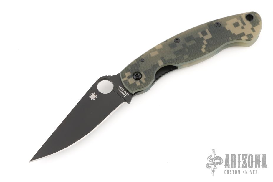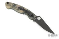 The Military folder by Spyderco has been in production since the 1990s in a variety of steels, materials and colors. This linerlock Military folder has a black S30V blade and digi-camo G10 scales. Blade choil and thumbrest are jimped for better control. The oversized blade hole makes opening a natural and smooth action even if wearing gloves. Black tip down carry. Excellent condition. Comes with original box and papers