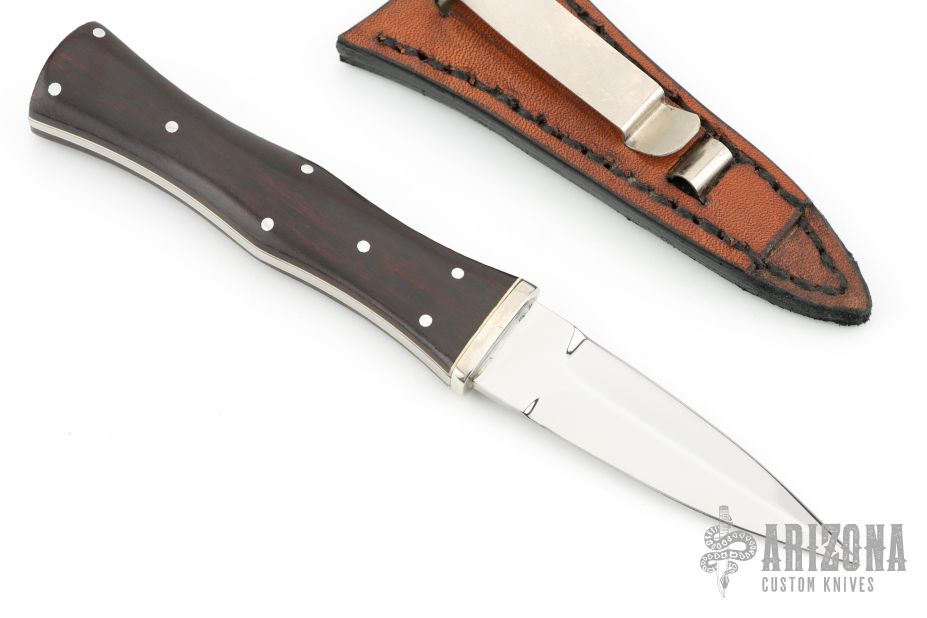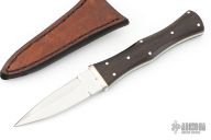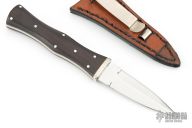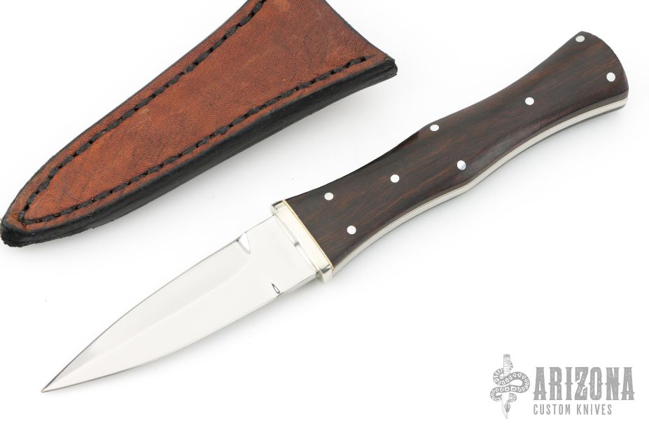 This Boot Dagger by Ralph Combs features a mirror polished double edged blade with .117" blade stock and .816" blade depth, full tapered tang construction. The handle has a nickel silver guard, ironwood scales and white liners. Comes with a brown leather sheath with clip. Excellent condition. The owner said he bought it from the makers table at the New York Custom Knife Show in 1980.