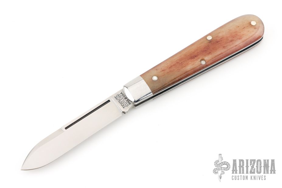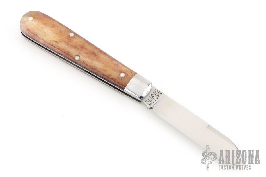 This Tidioute Cutlery 142116 Lick Creek Boy's Knife by Great Eastern Cutlery features a satin finished drop point blade with swedge and long pull. The handle has steel bolsters and brown camel bone covers and steel pins over steel liners and backspring. Half-Stop. Includes original cardboard tube. Excellent condition.