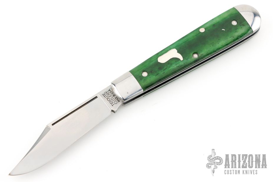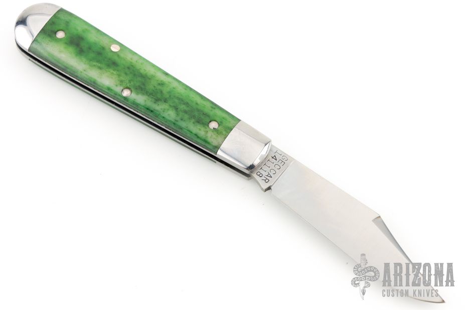 This slipjoint by Great Eastern Cutlery features a satin finished blade with nail nick. The handle has stainless steel bolsters, Smooth Deep Woods Green Bone covers with stainless steel liners/pins, steel spring. Has half-stop.  Comes with original tube. Excellent condition.