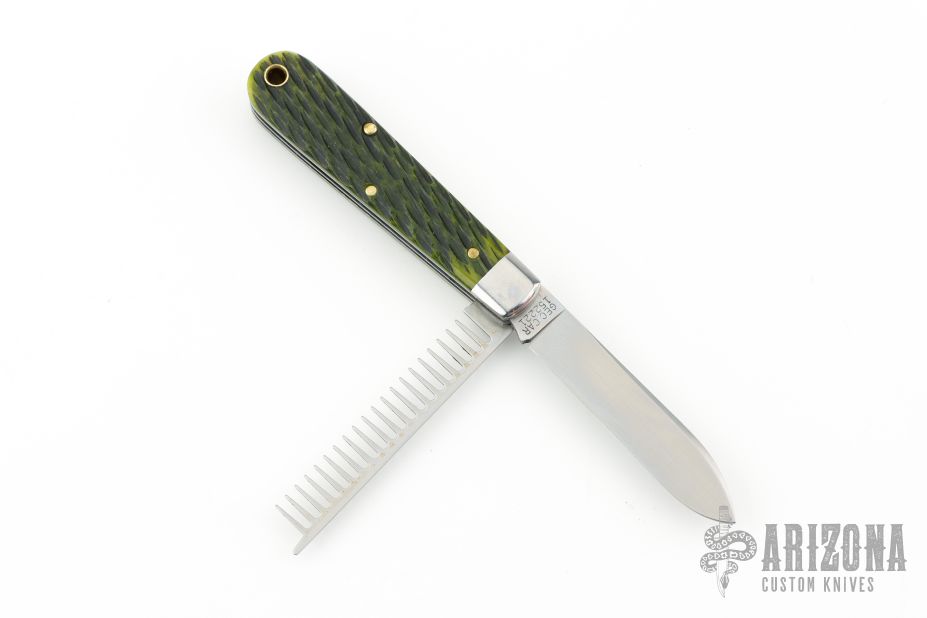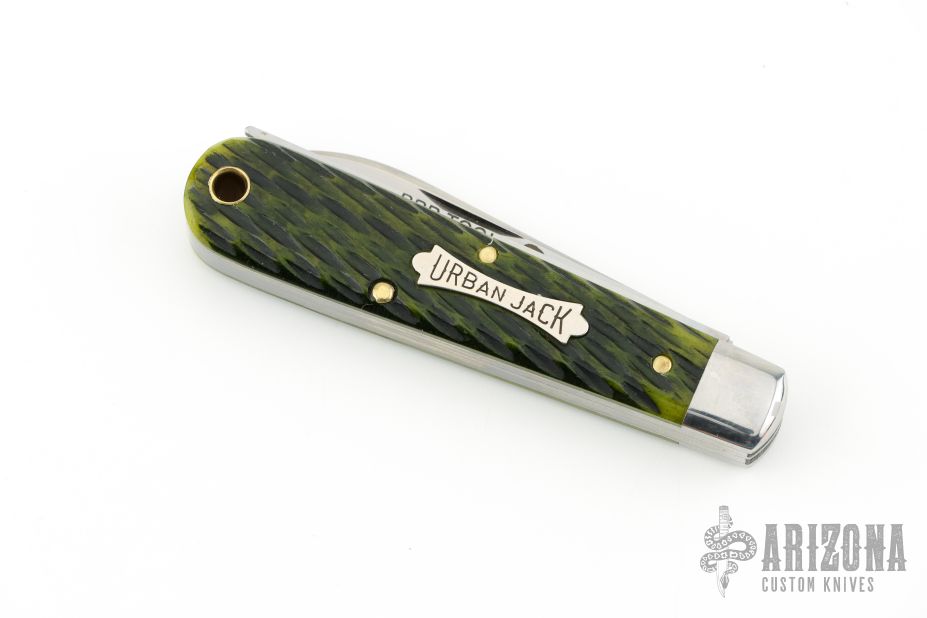 Handle: The teardrop shaped handle has stainless liners supporting securely pinned, Green Jigged bone covers for rugged visual appeal and traction in the hand. Brushed short stainless bolsters at the pivot are flush fit to the scales. Strong, full length stainless back springs, brass lanyard tube and pins complete the construction along with a wide, "Urban Jack" Bowtie shield round out construction.