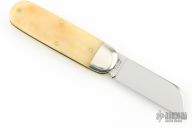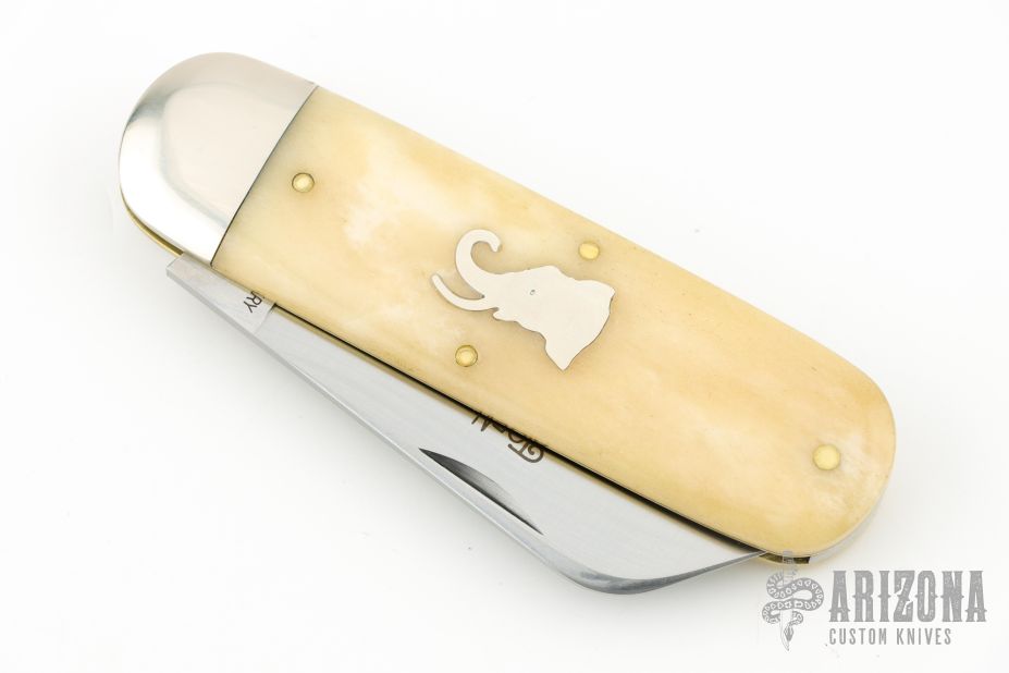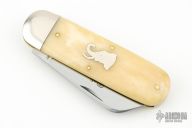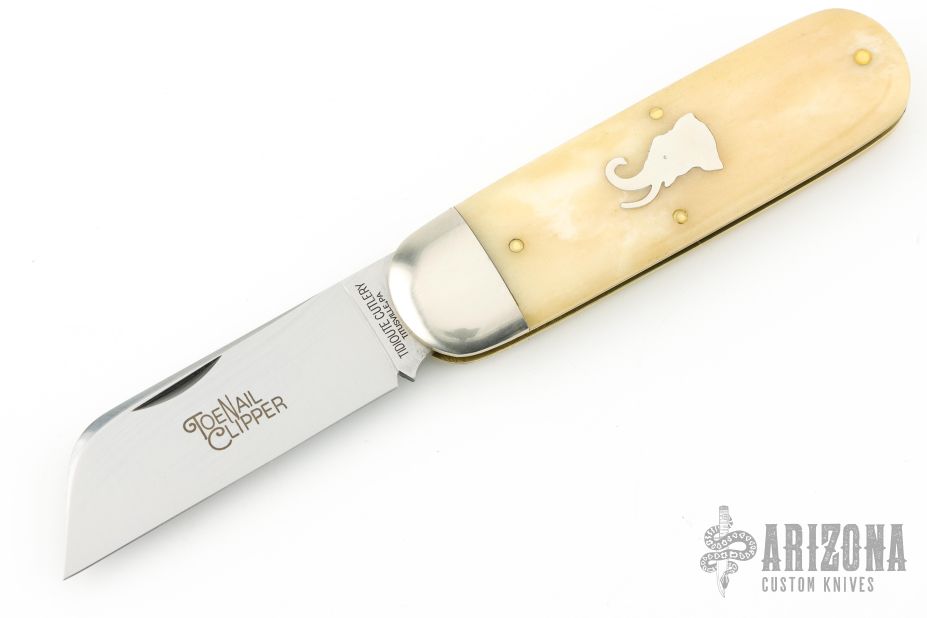 The Great Eastern Cutlery Toe Nail Clipper knife has a satin finished blade with nail nick. The handle has nickel silver bolsters, India Smooth Ivory Bone covers, nickel silver elephant escutcheon, brass liners and steel spring. Excellent condition. Comes with original tube.