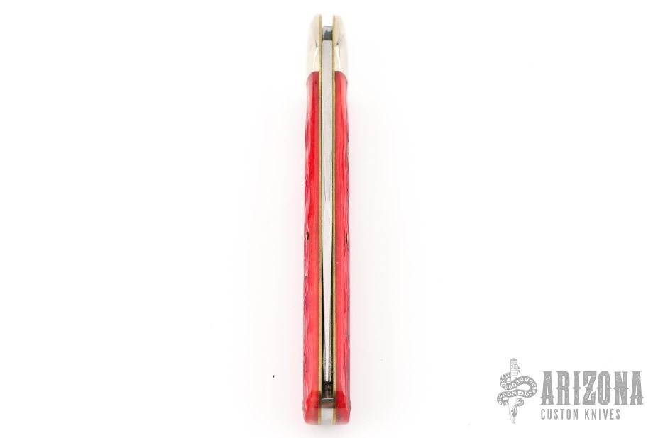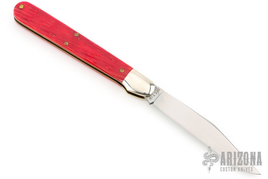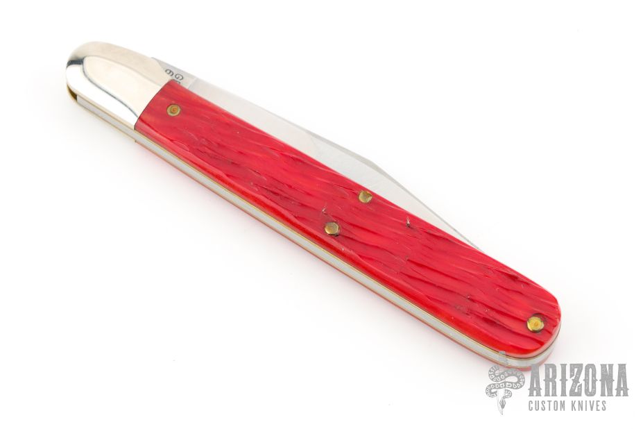 This knife by Great Eastern Cutlery features a polished finished blade with a single nail nick. The handle has nickel silver bolster, escutcheon and brass liners, jig bone covers. Has half-stop. Comes with original tube. Excellent condition. 50 Made