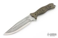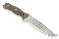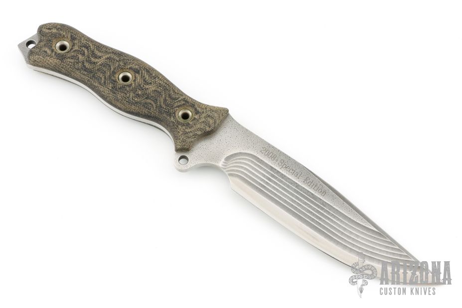This knife by Busse features a clip point blade with false top edge and milled bevels, .188" blade stock and 1.563" blade depth, full tang construction. The handle has canvas micarta scales. "2008 Special Edition" on blade. Excellent condition.