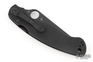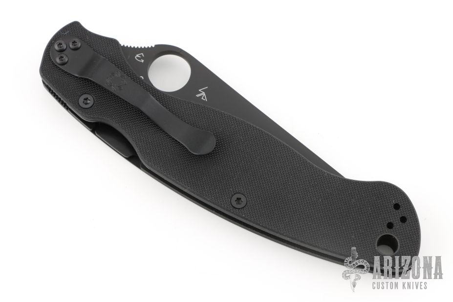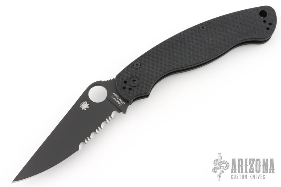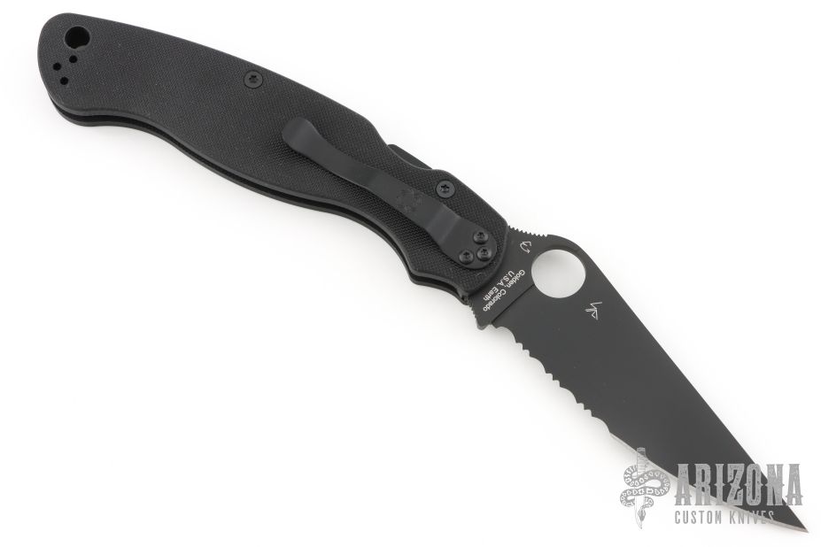 This Military Liner Lock by Spyderco has a black partially serrated blade with notched thumb rest and thumb hole. Handle is black G10, with stainless steel single liner (lock), black fiber back spacer, black stainless steel tip down clip, and lanyard tube pin. Comes with original box and papers. Excellent condition.