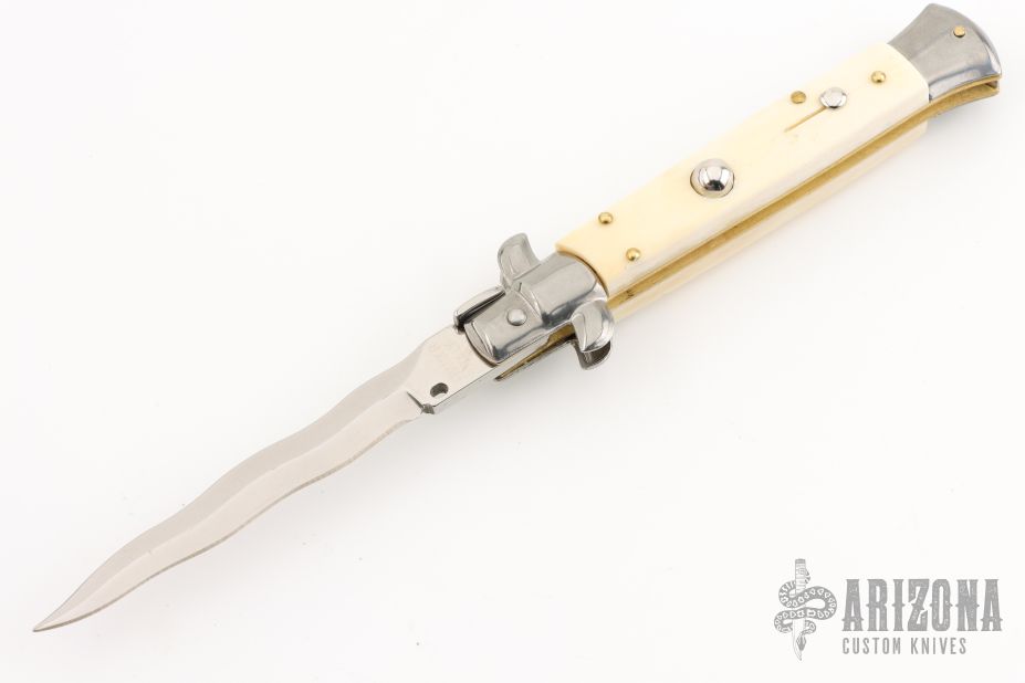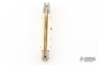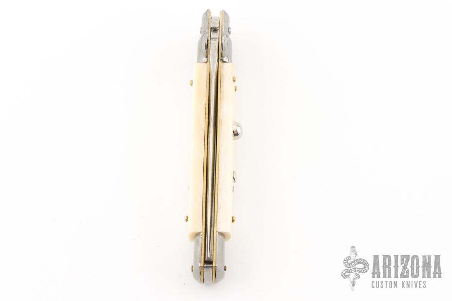 This Swivel Bolster by Frank Beltrame features a polished Kris ground blade with false top edge. The handle has stainless steel bolsters, front and rear, bone scales, brass liners, stainless spring. Has some light scratches, excellent condition.