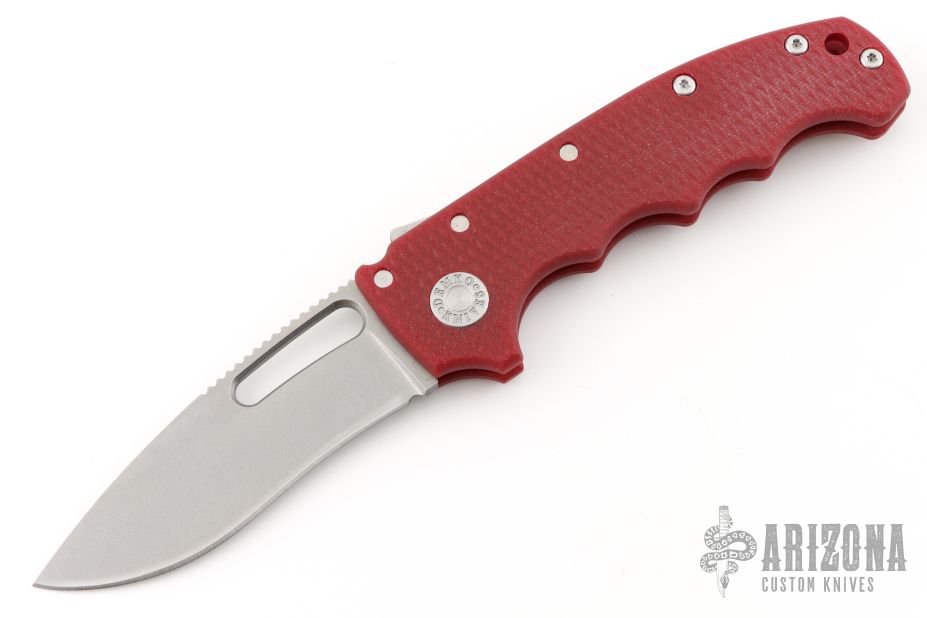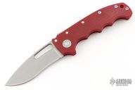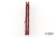 This AD20S by Andrew Demko features a stonewash finish blade with notched thumbrest, thumbhole and dual thumbstuds. The handle has a red G-10 frame with a tip up stainless steel clip and "Shark" lock release on the spine.  Comes with original box. New Condition.