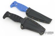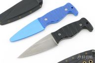 Has a stonewashed blade with .158" blade stock and 1.216" blade depth, full tang construction with black G-10 scales. Comes with original box, COA dated 10/3/22, Blue trainer, sheath for trainer, and sheath for the knife. The knife sheath also holds a fire steel in the sheath. Has a couple light scuffs, otherwise Excellent condition.
