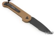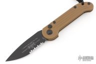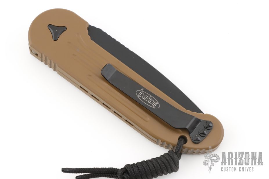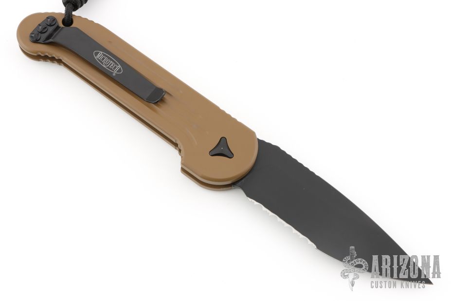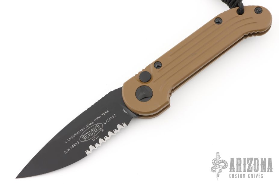 This LUDT auto by Microtech Knives has a black blade with a partially serrated edge and a tan aluminum frame with all black hardware. Stainless steel clip. Dated 07/2022 and serial number 26933. Comes with original box and papers. Excellent condition.