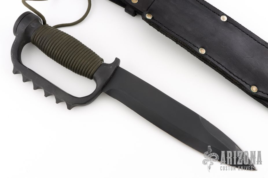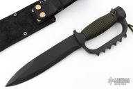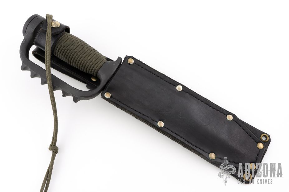 This Fighter by EDMF (Eight Dollar Mountain Foundry) features a black blade with sharpened top edge, .219" blade stock and 1.615" blade depth, hidden tang construction. The handle is cast aluminum, coated black handle with cord wrap. Comes with a black leather sheath with leather belt loop. Has some light scuffs/scratches, otherwise excellent condition. This knife is dated 2/02.