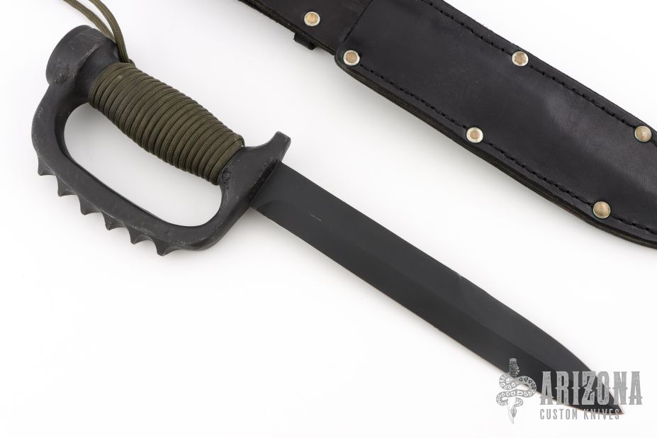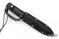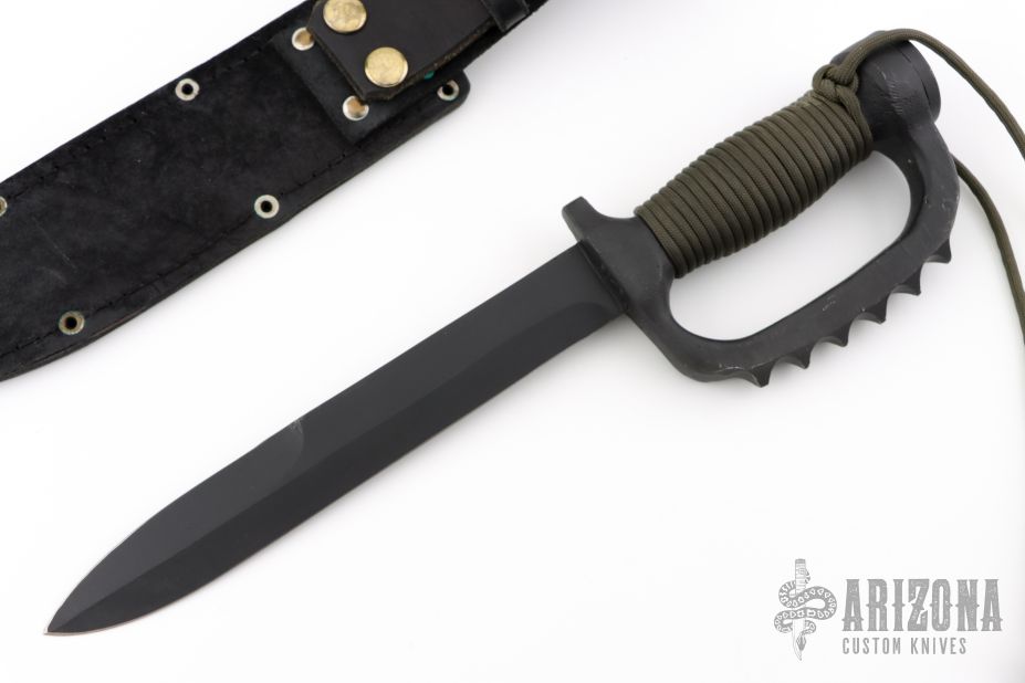 This Fighter by EDMF (Eight Dollar Mountain Foundry) features a black blade with sharpened top edge, .170" blade stock and 1.130" blade depth, hidden tang construction. The handle is cast aluminum, coated black handle with cord wrap. Comes with a black leather sheath with leather belt loop. Has some light scuffs/scratches, otherwise excellent condition. This knife is dated 2/02.