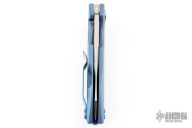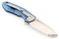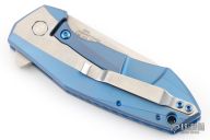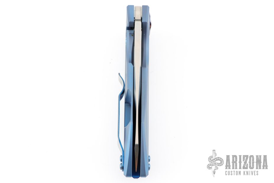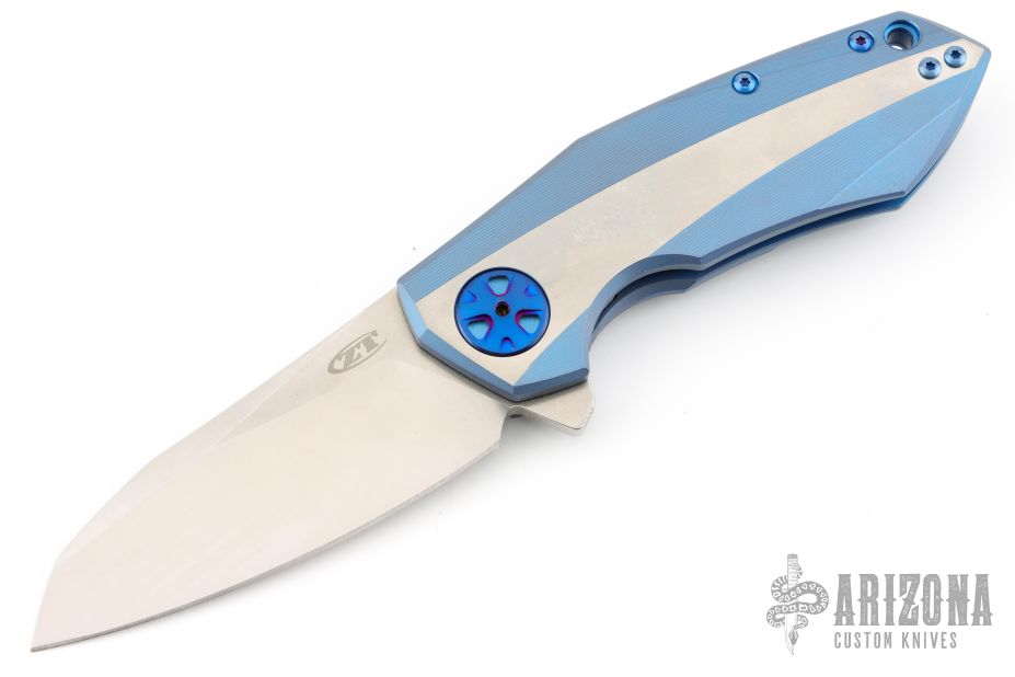 This ZT 0456 by Zero Tolerance features a satin finished clip point blade with swedge and flipper. The handle has a machined titanium frame over an anodized aluminum backspacer. Lanyard hole in pommel and stainless steel clip is positioned for tip up carry. Has aftermarket 2-Tone anodized finished covers and anodized hardware. Has some light scratches. #4673 on the Blade. Great condition.