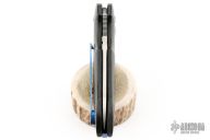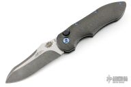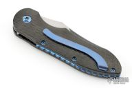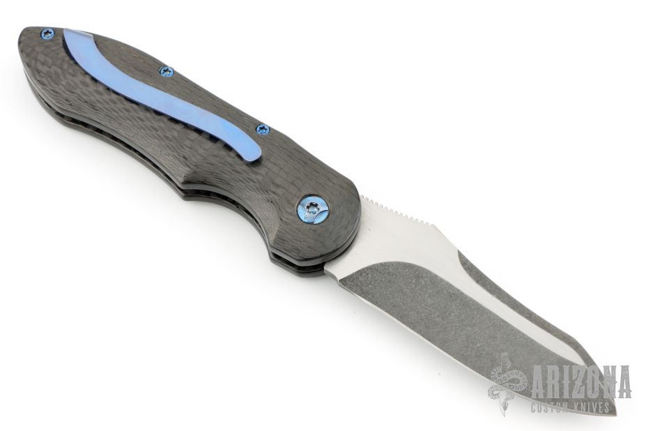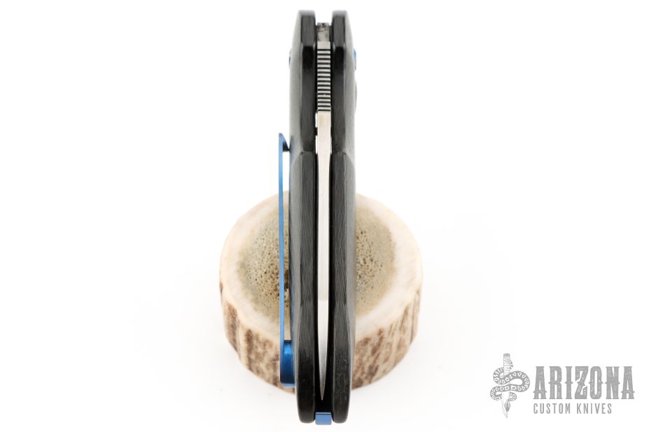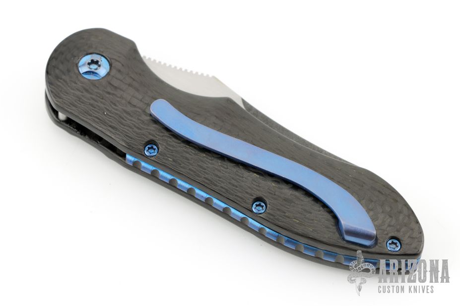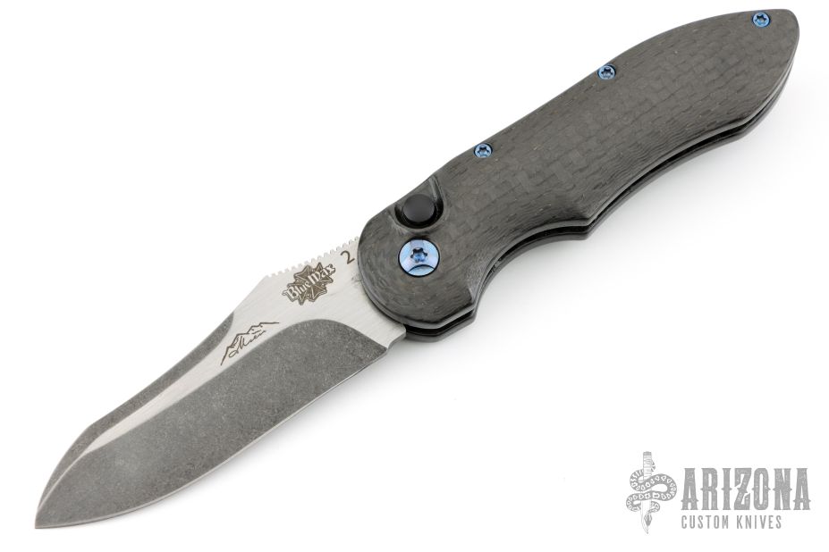 This Blue Max Auto 2 by Jerry Moen features a satin and acid tumble finished blade with notched thumbrest. The handle has a carbon fiber frame, tumbled and anodized titanium backspacer and a tip up clip with hidden screws, has blue anodized titanium hardware. Fires hard! Has some light scuffs and scratches, great condition otherwise.