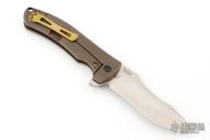 This 0920 Les George Design Flipper by Zero Tolerance features a stonewashed clip point recurve blade with notched thumbrest and flipper. The handle has a milled and anodized titanium frame with black pivot and anodized tip up reversible clip, bronzed barrel spacers. S/N 3437. Has aftermarket anodized finish, a few light scuffs and scratches, excellent condition.