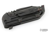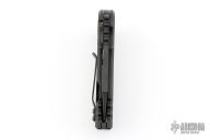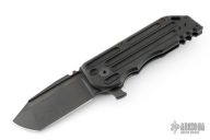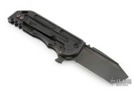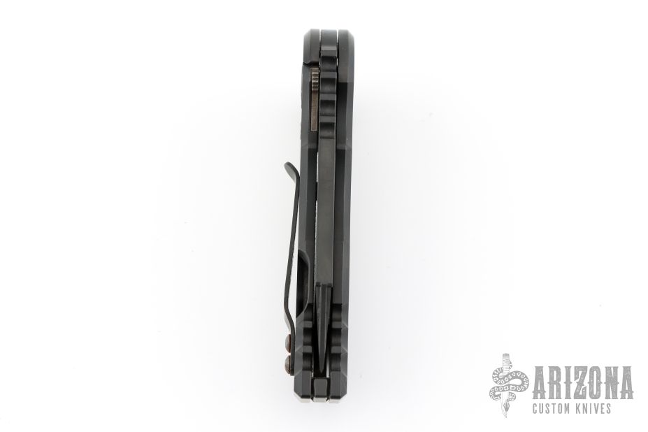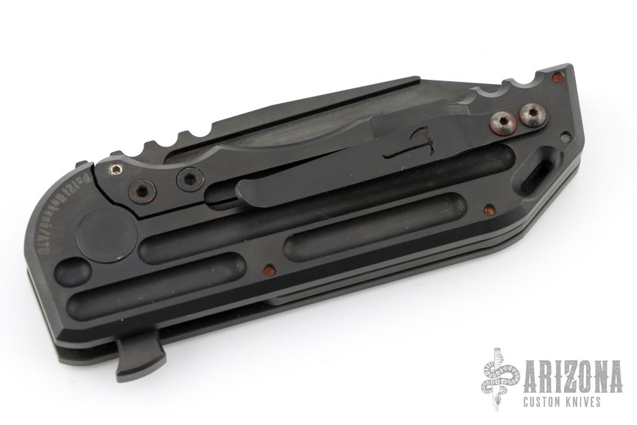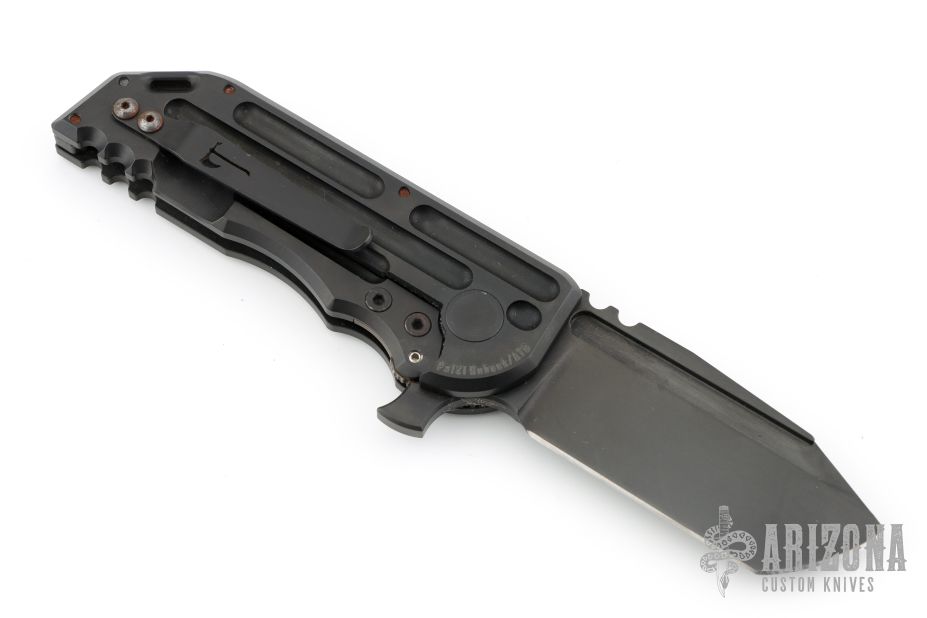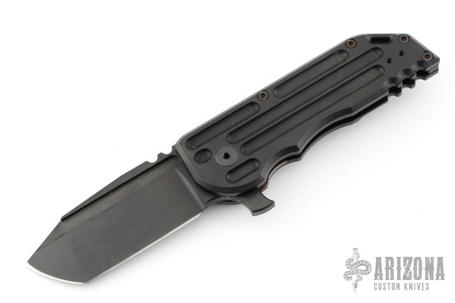This Black Stallion WarHorse is a collaboration between Jake Hoback Knives and Alphahunter Tactical Design. It features a black Fallout finished blade with fullers, notched thumb rest and flipper. CPM-Cru-Wear blade steel. The handle is comprised of black Fallout finished machined titanium over a black DLC titanium floating backspacer. Titanium tip up clip and lanyard hole in pommel. Has some light scuffs and scratches, great condition otherwise.