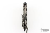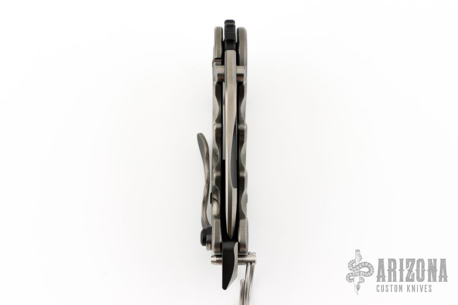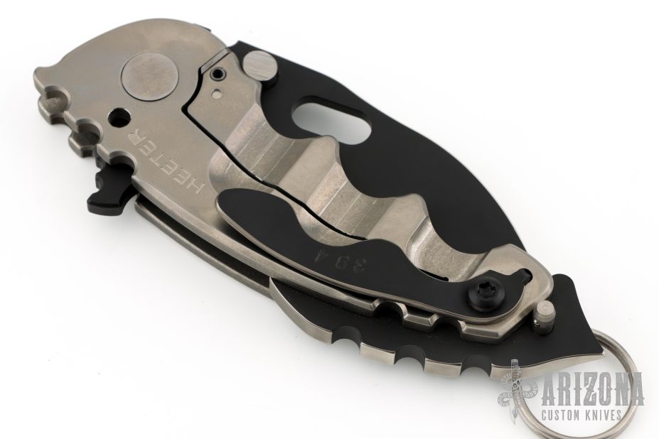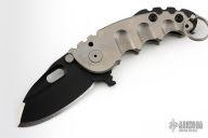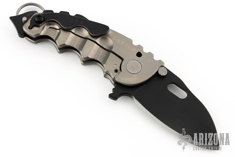 This P-O-W flipper by TS Heeter features a black PVD coated drop point blade with notched thumbrest, thumbhole and flipper. The handle has a titanium frame with a tip up reversible titanium clip, steel backspacer. Has a pin with split ring that can be used to lock the blade open, or it can be removed to reveal a lanyard hole. Nice detent, lockup and blade seating. #394 on clip. Has some light scuffs, excellent condition otherwise.