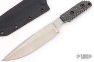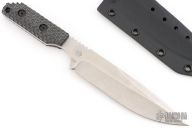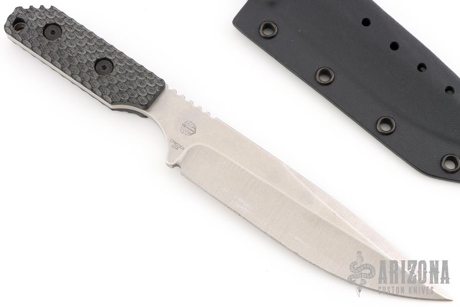 This SA-XL by Mick Strider features a stonewashed spear point blade with notched thumbrest, .185" blade stock and 1.326" blade depth, full tang construction. The handle has black G-10 gunner grip scales. Comes with a kydex sheath. Excellent condition.