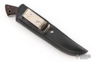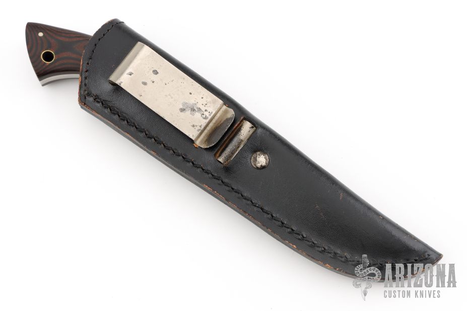 This dagger features a satin finished blade with a false top edge and notched thumbrest, .175" blade thickness and .871" blade depth, full tang construction. The handle has nickel silver bolsters and brown paper micarta scales with nickel silver pins. Great feel in the hand. Classic Samson design. Includes leather sheath. Excellent condition.