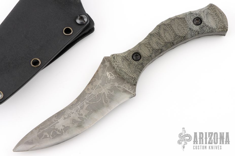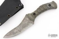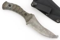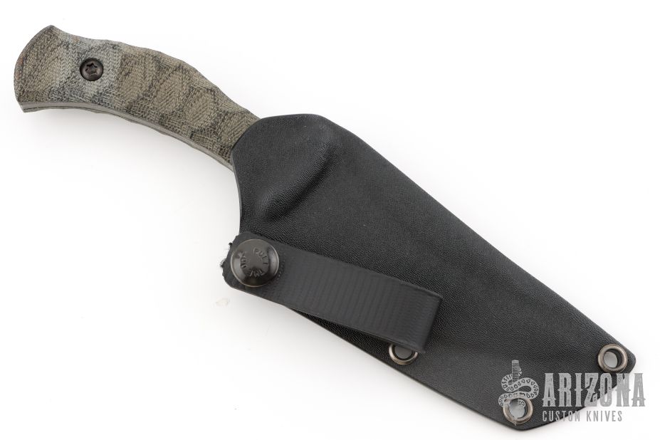 This knife by Kiku Matsuda features a spear point blade with sharpened top edge, .162" blade thickness and 1.511" blade depth, full tang construction. The handle has black canvas micarta scales. Comes with kydex sheath. Has some light scuffs and the tip is missing, otherwise good condition.