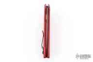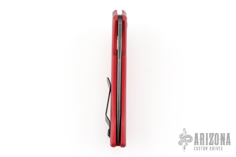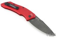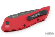 This Launch Auto #1 by Kershaw features a blackwash finished blade with swedge. The handle is red aluminum with push button and tip up reversible black stainless steel clip, lanyard hole at the butt. Comes with original box and papers. Has some light scuffs, excellent condition otherwise.