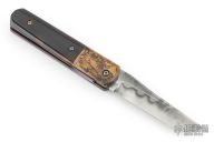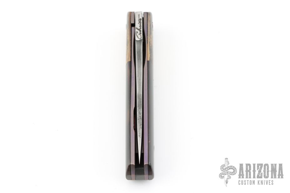 This Mini Yakuza by Chuck Gedraitis features a tanto blade with nail nick and nice hamon. The he handle has copper bolsters, pen shell scales, anodized titanium liners and a carbon fiber backspacer. Nice detent, lockup and blade seating. Excellent condition. Comes with COA.