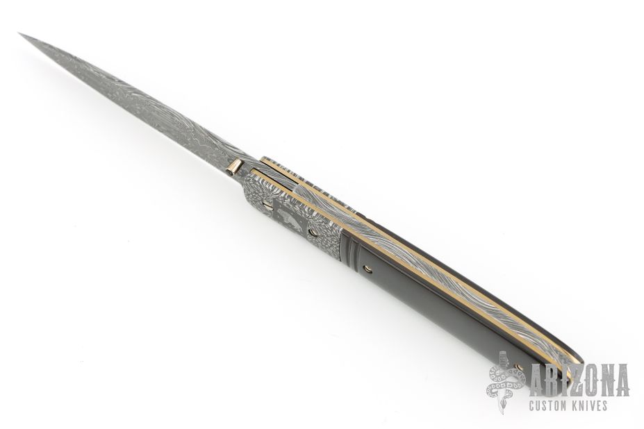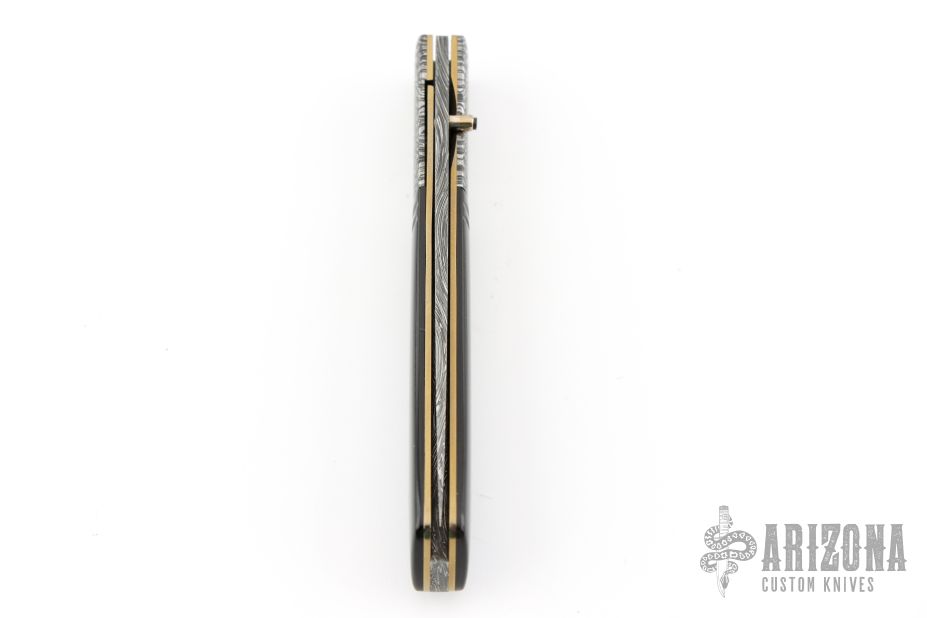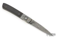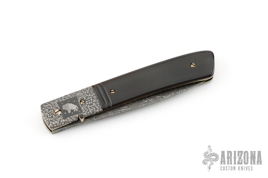 This linerlock folder by Cliff Parker features a Damascus blade with a single thumstud with black stone inset. The handle has Mosaic Damascus bolsters, buffalo horn scales, anodized titanium liners, and a Damascus backspacer. Nice detent, lockup and blade seating. Comes with a zipper case. Excellent condition.