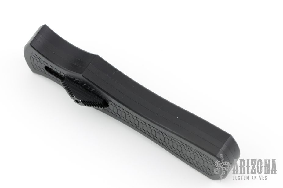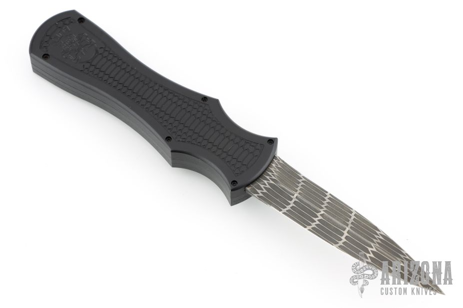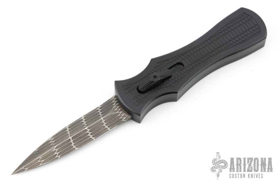 This Burn Palm Viper OTF has a hollow ground clip point blade made from Damascus from Vegas Forge. Chassis is cut from black aluminum. Blade deploys with authority and locks up tight with minimal blade play. Comes with zippered case. Has some light scuffs and scratches, great condition otherwise.