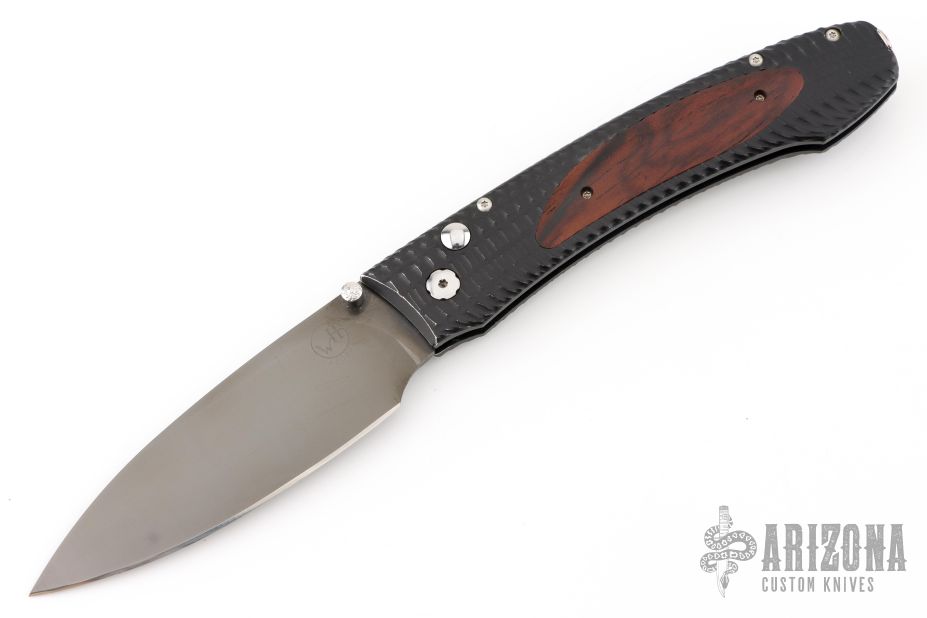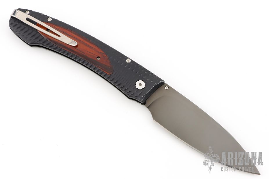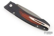 This E10 folder features a black blade coated with a molecular bond of Tungsten Carbide for superlative wear resistance.The frame is T6061 aluminum hard anodized for long life. Cocobolo inlays. Stainless and Titanium fittings. #3386 on blade. Comes with original box and papers dated May 8, 2018. Has some minor wear on the frame, otherwise good condition.