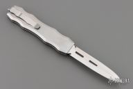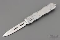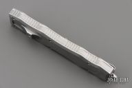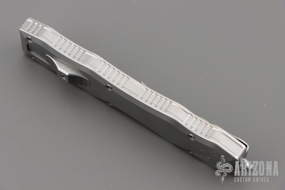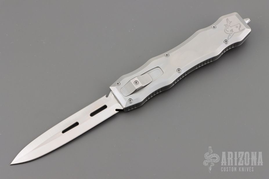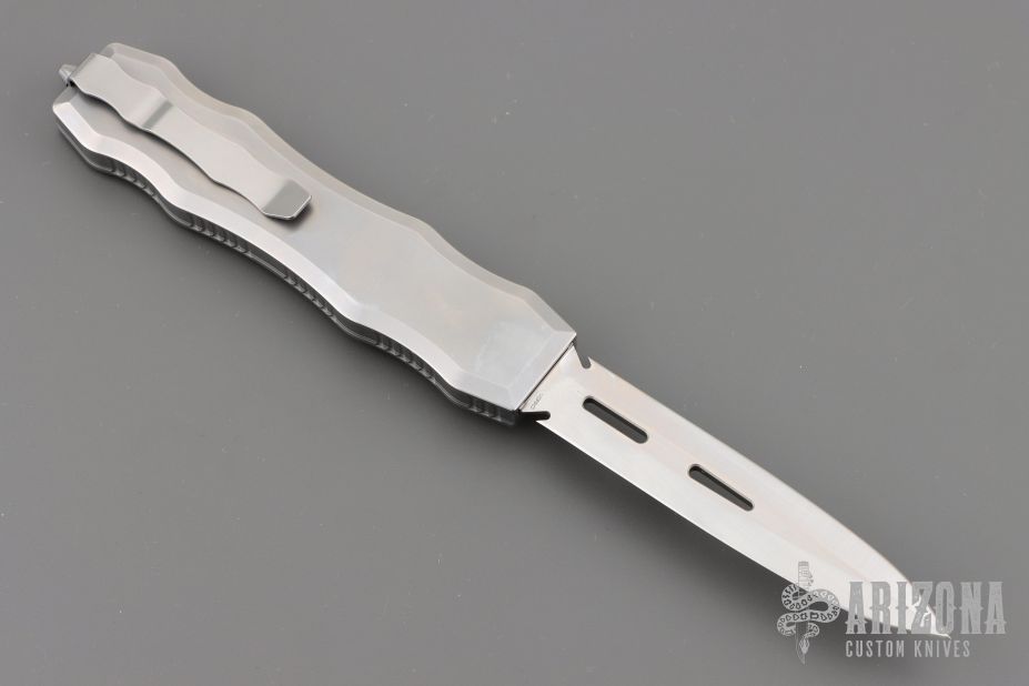 This Brand New Sand Shark OTF double action automatic by Desert Knife Works features a satin finished double edge blade and a bead blasted stainless steel handle with matching tip down clip. Comes with original tube and pouch. Excellent condition.