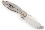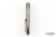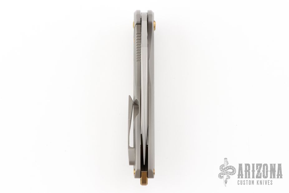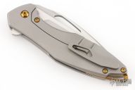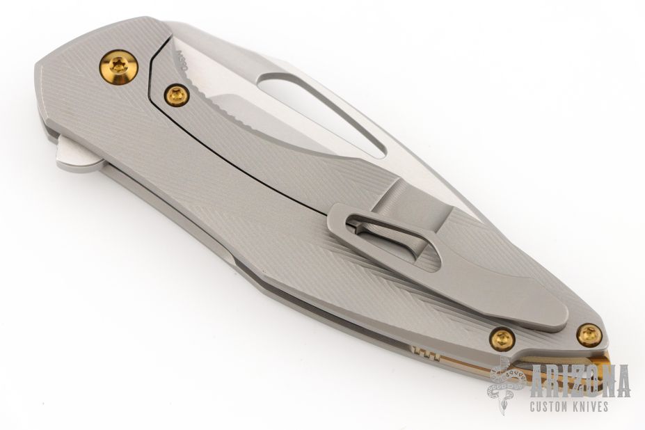 This Mini Arius by Koenig knives features a burnished w/ PF finished blade with thumbhole and flipper. The handle has a bead blasted and patterned titanium frame with a titanium tip up clip, anodized titanium backspacer. Has ceramic bearings and a ceramic detent ball. Nice detent, lockup and blade seating. Comes with original box and COA February 14, 2024. Has a light scuff on the clip, otherwise excellent condition.