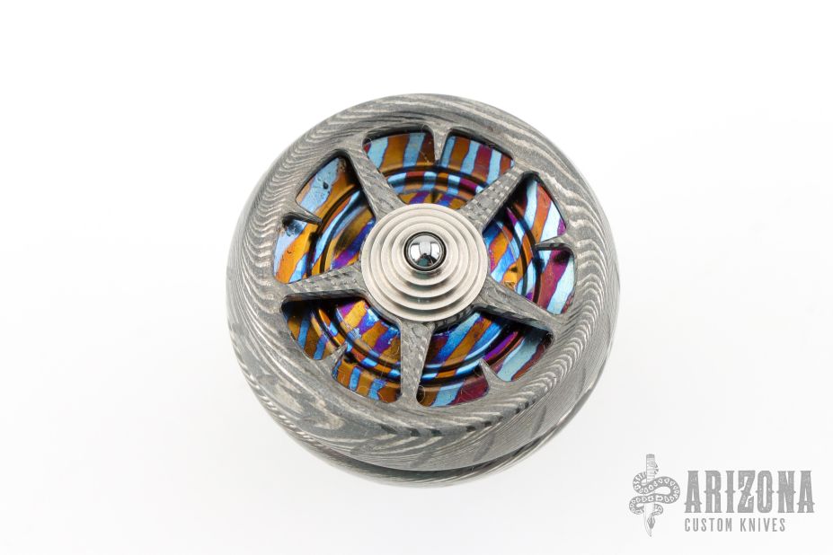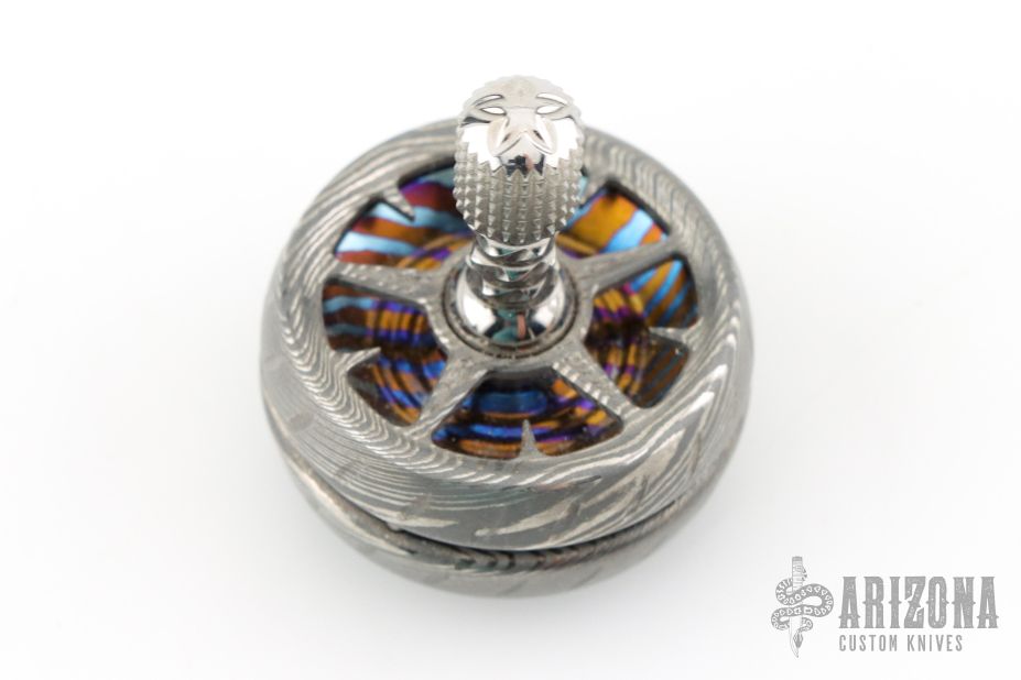 This Matrix Top by Billetspin is made from Damascus with Timascus inlays and a checkered titanium post. Excellent condition.