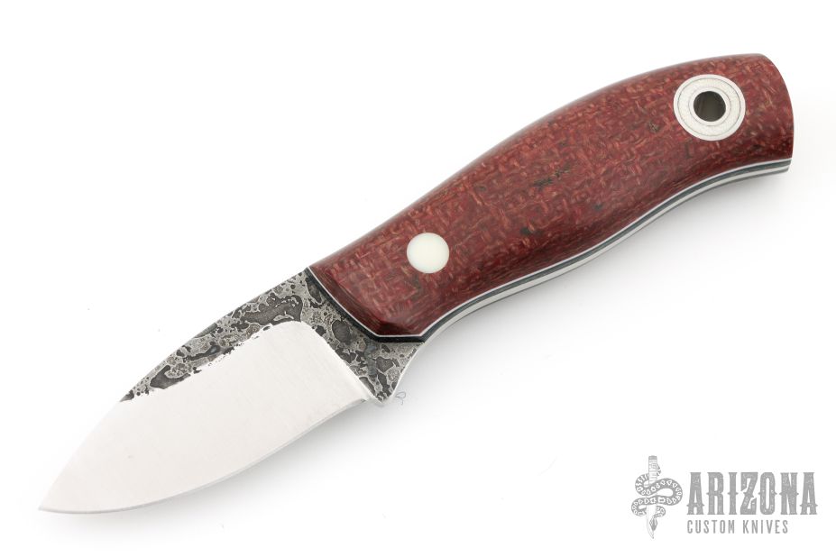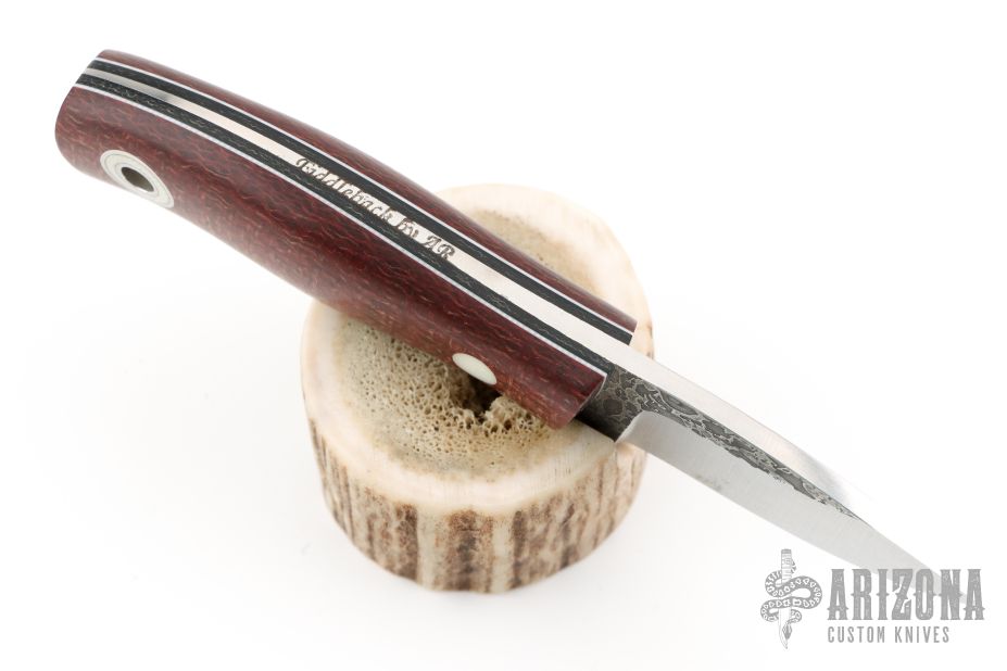 Hi, I am Andy Roy, the maker at Fiddleback Forge, LLC. I started making knives in 2007, and went full time May 1, 2009 when I got laid off of my last engineering position. I consider myself a toolmaker, and much of the focus of my work is in the handle. I strive to make the most comfortable handle you?ve ever held. It is important to me that you can hold the knife in many positions comfortably and do hard extended work with the blade. I also think it is important for the handle to index the knife in your hand, so that no matter how you hold it, you know where the edge is without having to look. I use a variety of steels, and my favorite grinds are convex, and Scandi. In 2010 I spent a lot of time developing a finish treatment for the flats of my knives that I call 3D Spalted Steel. It adds a unique character to my blades, and I think it complements the refined handle work well. I am very excited to be working with Arizona Custom Knives, and hope you enjoy the Fiddleback Forge knife you buy from them.