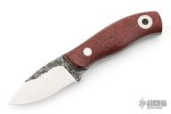 This Runt by Fiddleback Forge features a drop point 01 Tool steel blade, spalted flats, satin bevels, .123" blade stock and .879" blade depth, full tapered tang construction. The handle has burlap micarta scales. Excellent condition.