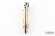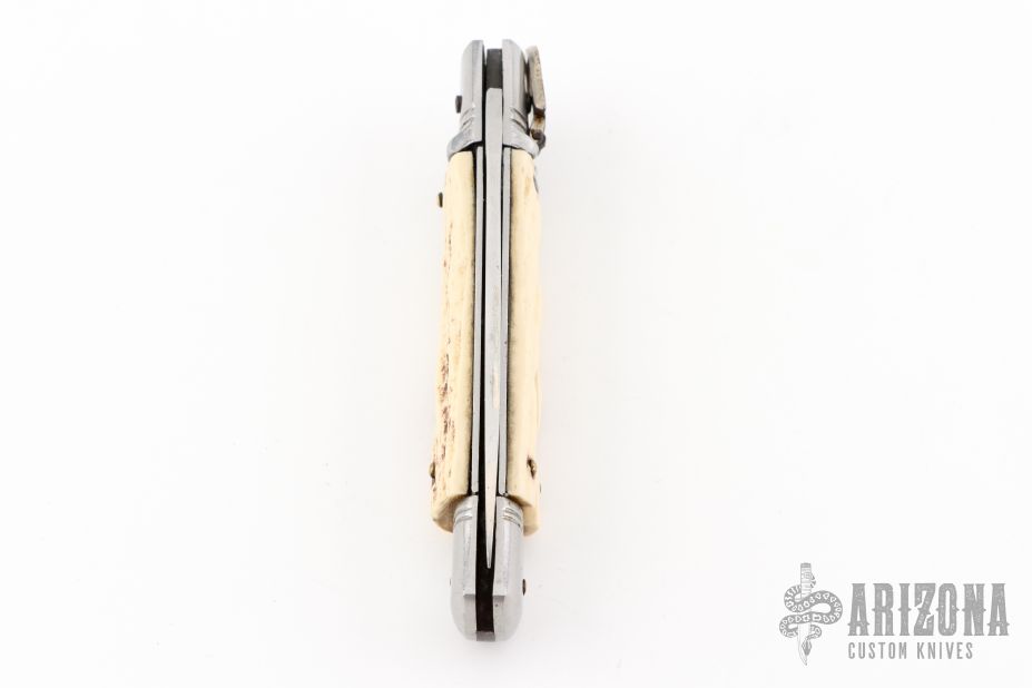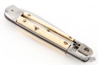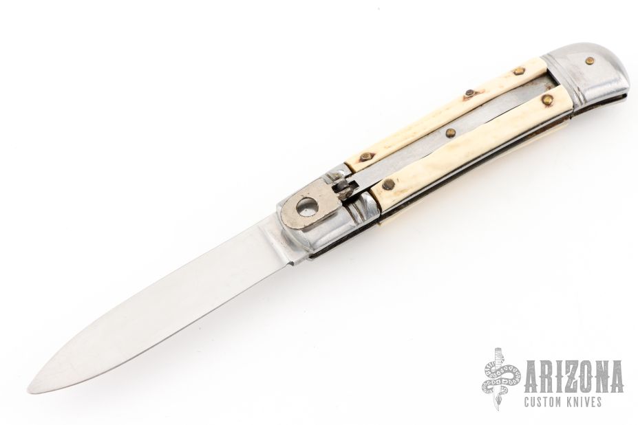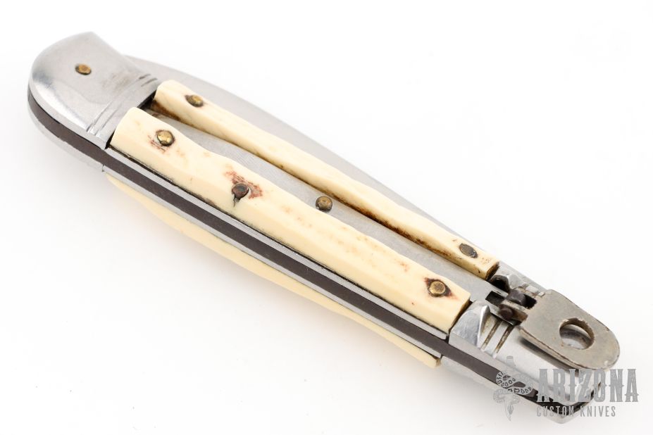 This leverlock auto features a polished blade with a steel spring. The handle has stainless bolsters and butt, stag scales and stainless liners. Has some scratches, has some oxidation on the backspacer, the blade doesn't lock, poor/fair condition.