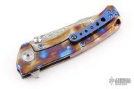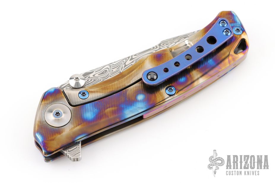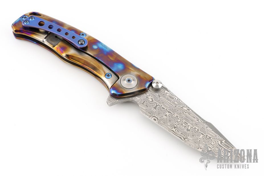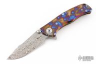 This Torrent by Reate Knives features a Damasteel blade with notched thumbrest, dual thumbstuds and flipper. The handle has a milled and flame finished titanium frame with matching tip up clip with a ceramic ball, two-tone anodized backspacer, lanyard hole, anodized hardware. Rides on bearings, nice detent, lockup and blade seating. Comes with zippered case. Has a couple light scratches, otherwise excellent condition.