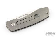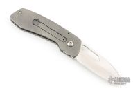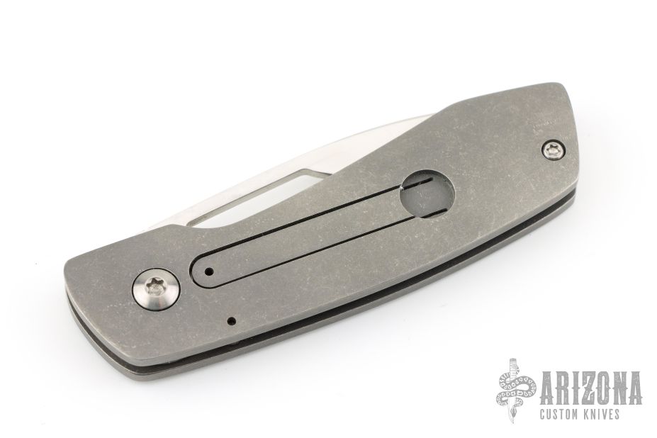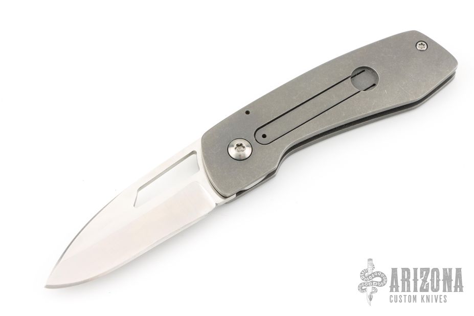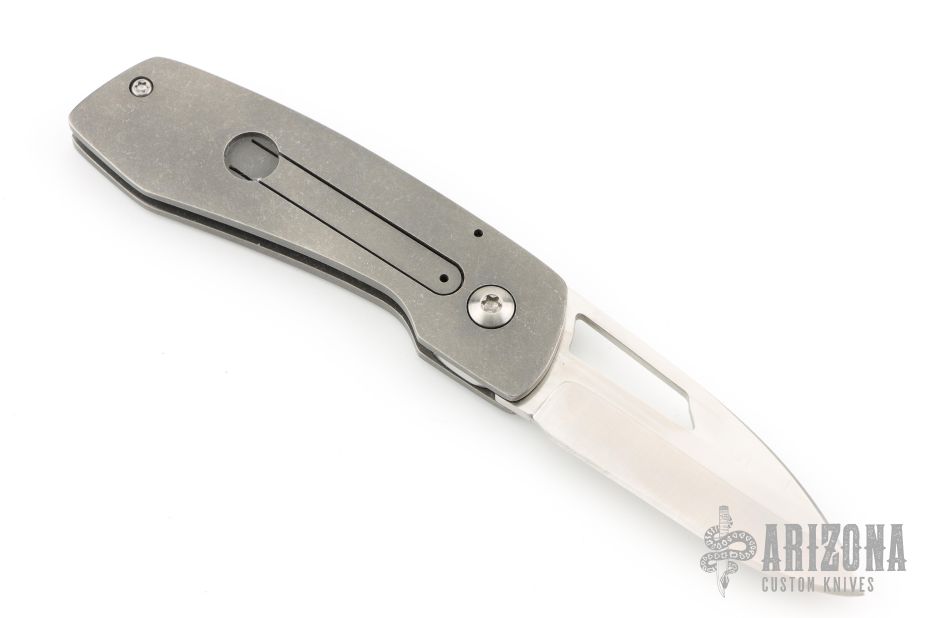 This double detent slip joint by Seamus Knives features a satin finished drop point blade with an oversized finger hole. The handle is composed of tumble finished titanium with a single standoff. Nice detent, lock up and blade seating. Very cool design. Has some light scuffs, excellent condition otherwise.