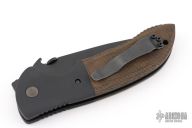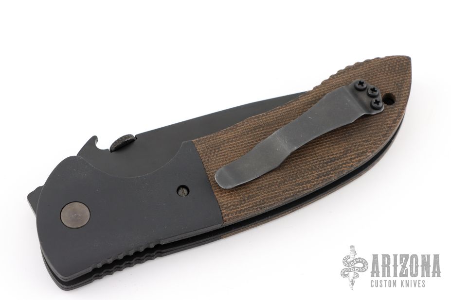 This PoBoy Emerson Super Commander by Andrew Charlet features a black recurve blade with knurled titanium thumbdisc and wave feature. The handle has black dovetailed titanium bolsters, micarta scales, black titanium liners and a tip up stainless steel clip. Comes with original box.  Excellent Condition.