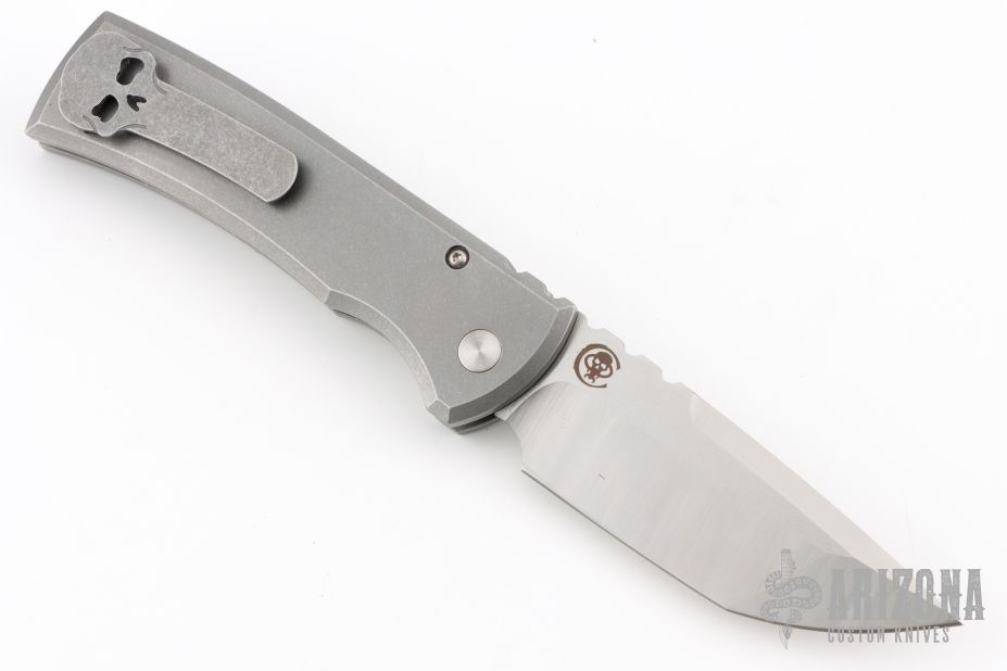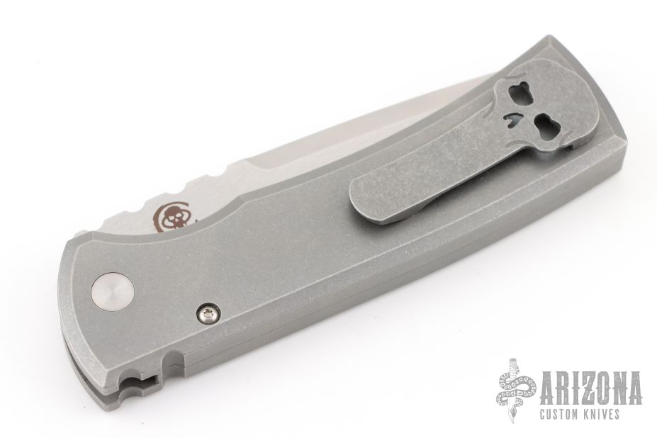 This 2025 Redencion Custom 001 by Pro-tech features a satin finished blade with notched thumbrest. The handle has a stonewashed stainless steel frame with matching tip up skull clip. Black lip pearl inlaid button. Comes with original box and papers. Excellent condition.