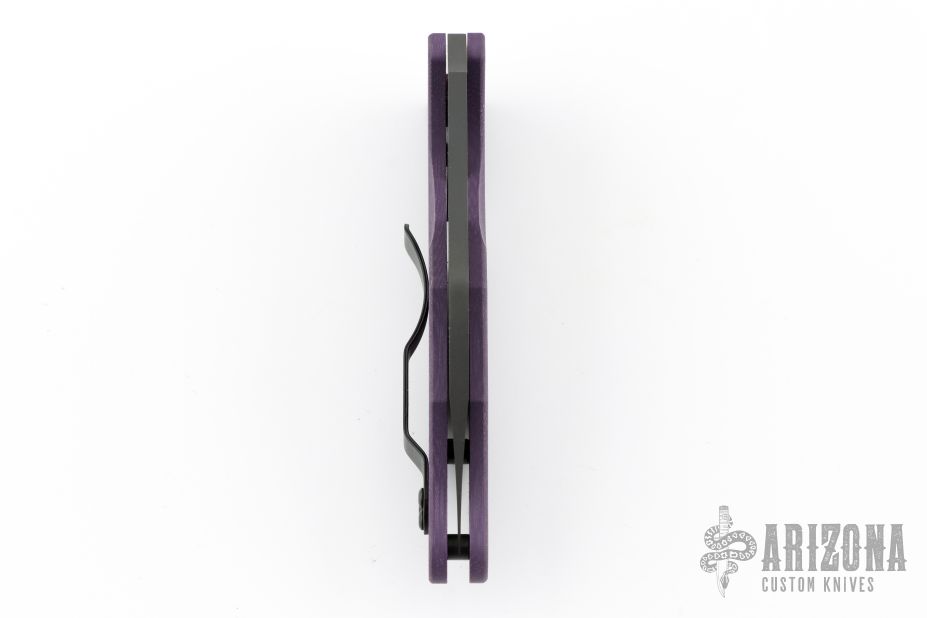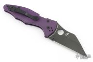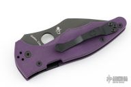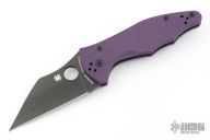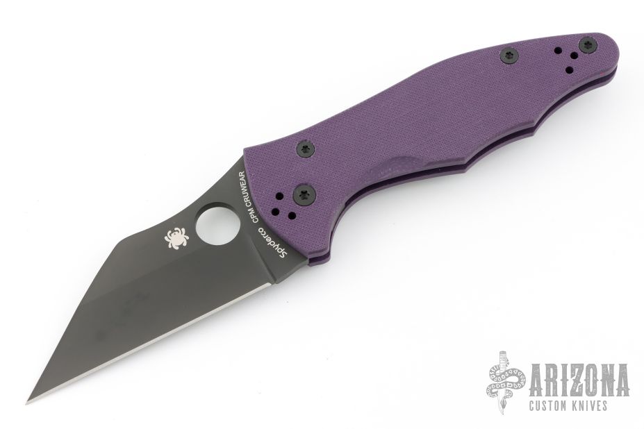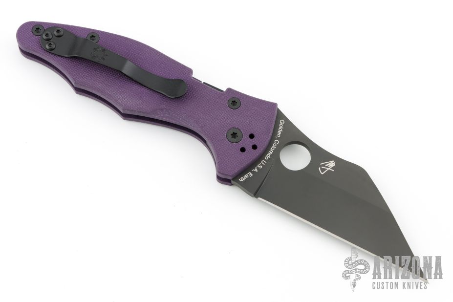 This Yojimbo 2 by Spyderco features a black finished wharncliffe blade with thumbhole. The handle has a purple G-10 frame with stainless steel liners, lock is on the spine of handle. 4-way reversible stainless steel clip. Nice detent, lockup and blade seating. New condition. Comes with original box and papers.