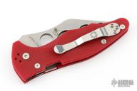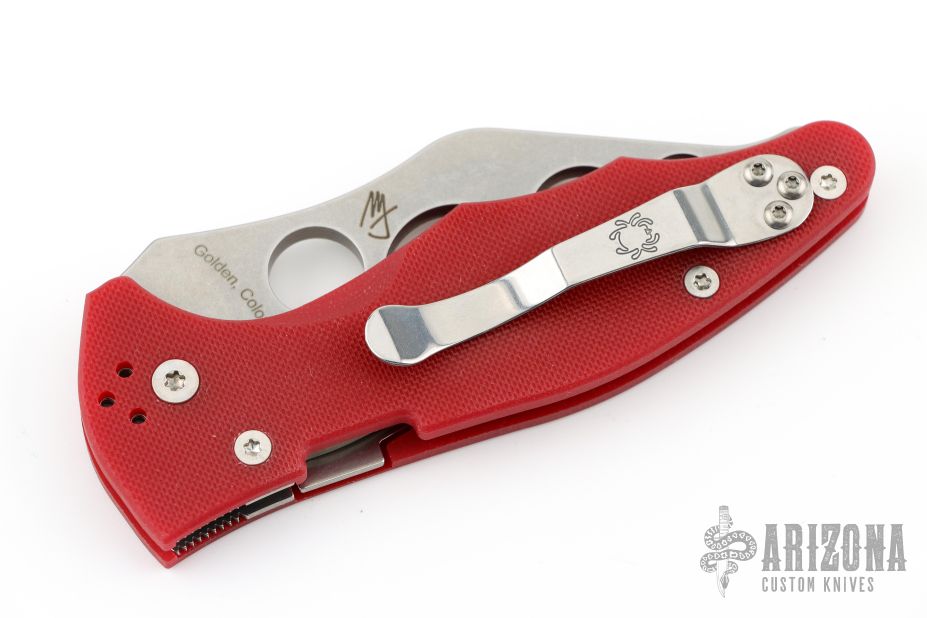This Yojimbo 2 by Spyderco features a stonewash finished wharncliffe trainer blade with thumbhole. The handle has a red G-10 frame with stainless steel liners, lock is on the spine of handle. 4-way reversible clip. Nice detent, lockup and blade seating. New conidtion. Comes with original box and papers.