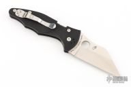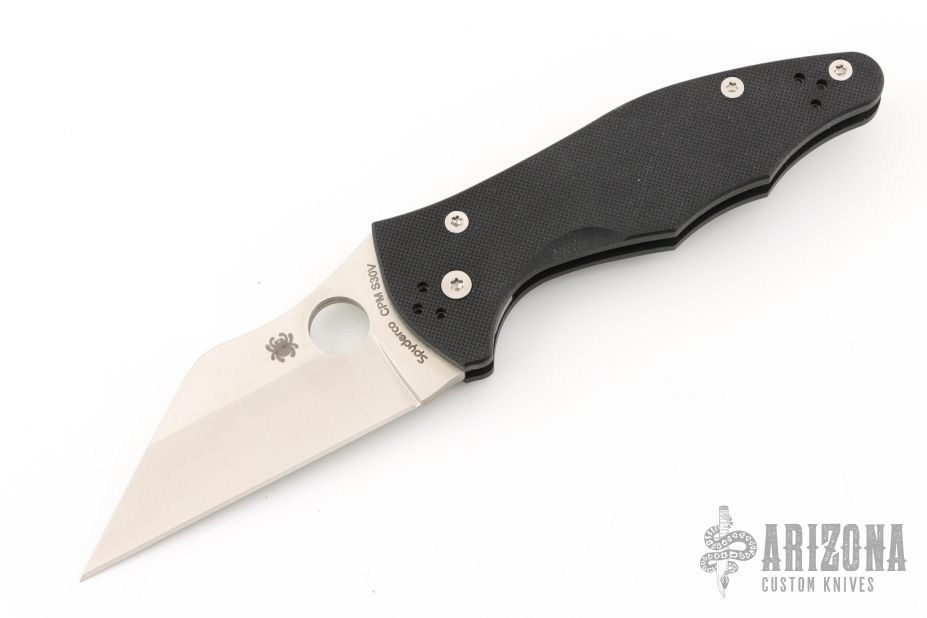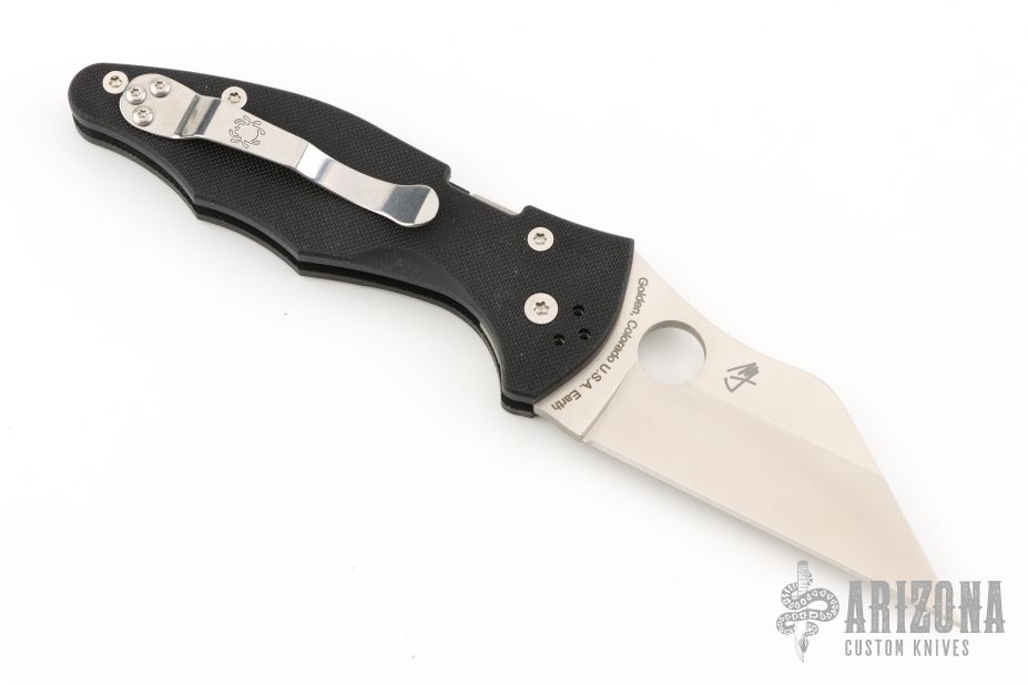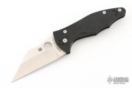This Yojimbo 2 by Spyderco features a satin finished wharncliffe blade with thumbhole. The handle has a black G-10 frame with stainless steel liners, lock is on the spine of handle. 4-way reversible clip. Nice detent, lockup and blade seating. New conidtion. Comes with original box and papers.