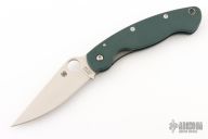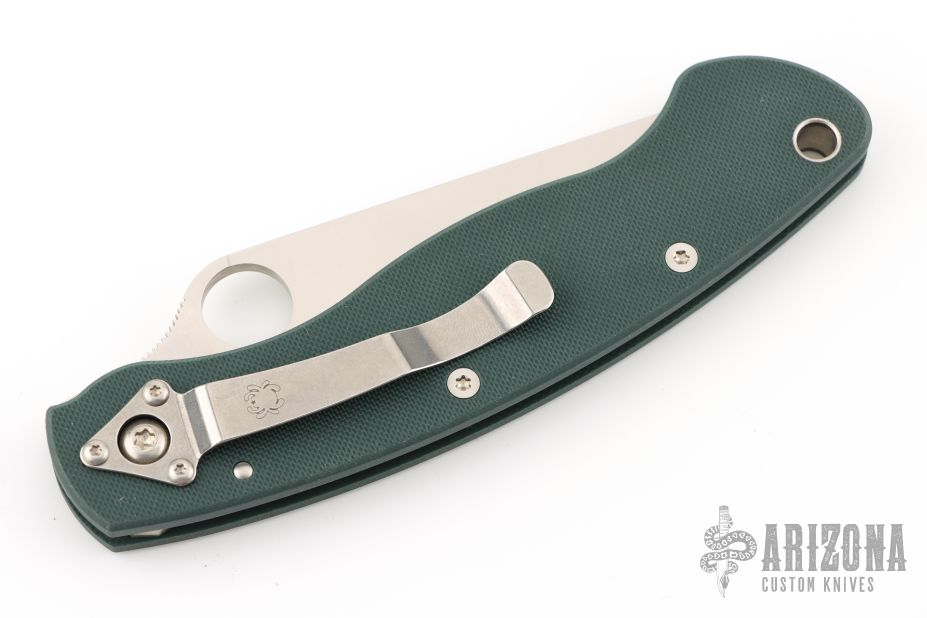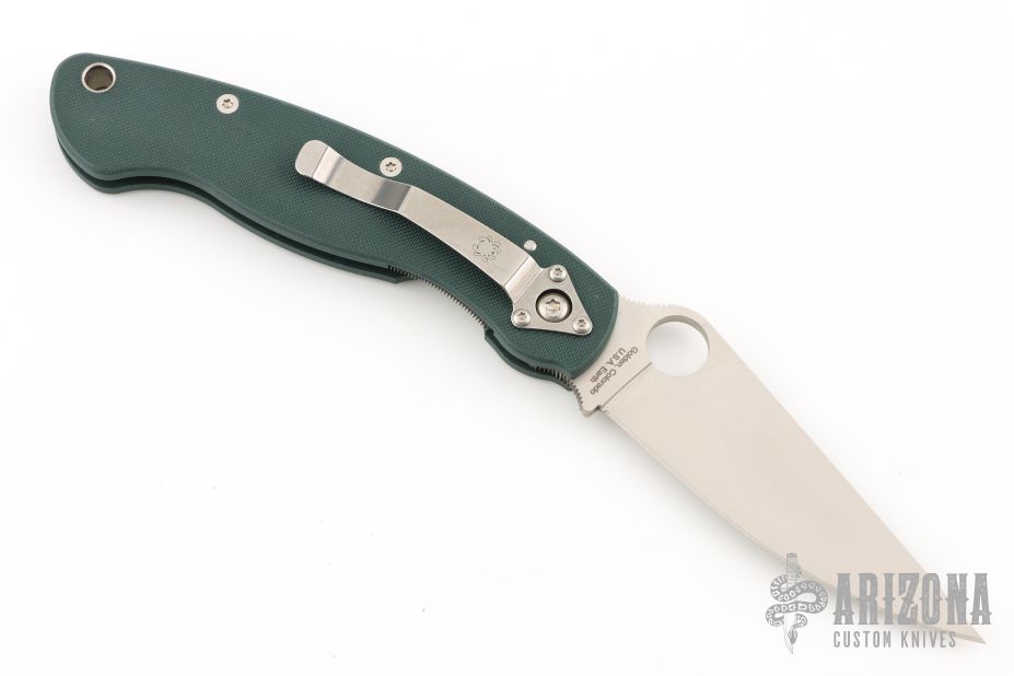 This C36GPGR Military from Spyderco was an exclusive configuration done for Knifeworks. It features a satin finish full flat ground clip point blade with thumb hole and notched thumb rest. The handle is comprised of green peel-ply textured G10 scales over skeletonized stainless steel liners. Stainless steel tip down clip and steel lanyard tube in pommel. Includes original box and paperwork. New condition.