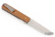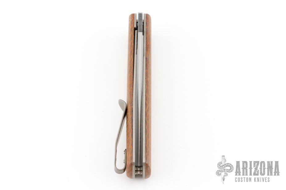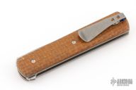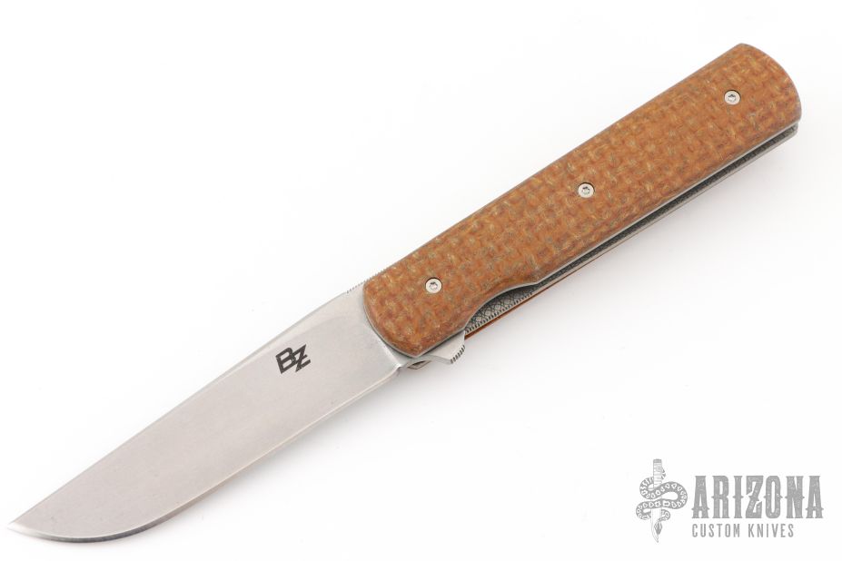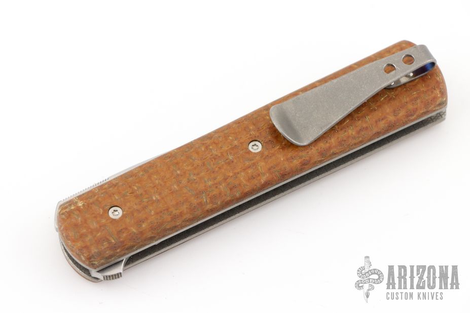This Urban Barlow Flipper by Brad Zinker features a tumbled blade with notched thumbrest and flipper. The handle has thunderstorm Kevlar micarta scales, tumbled titanium liners and a tip up titanium clip. Rides on bearings, nice detent, lockup and blade seating. Comes with zippered case. This was the prototype for a Boker collaboration. Excellent condition.
