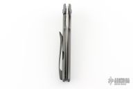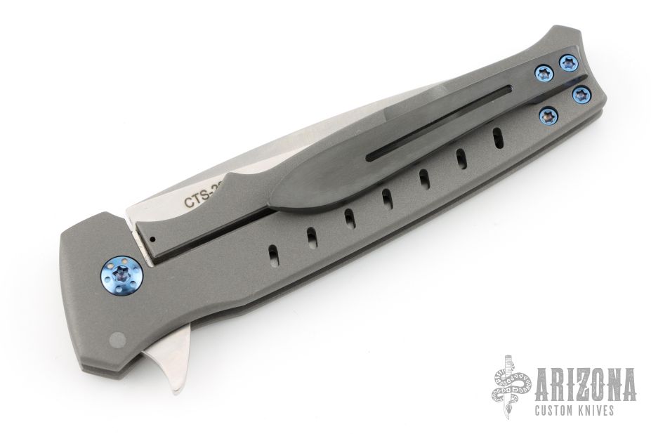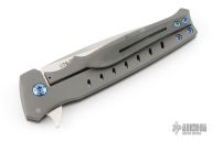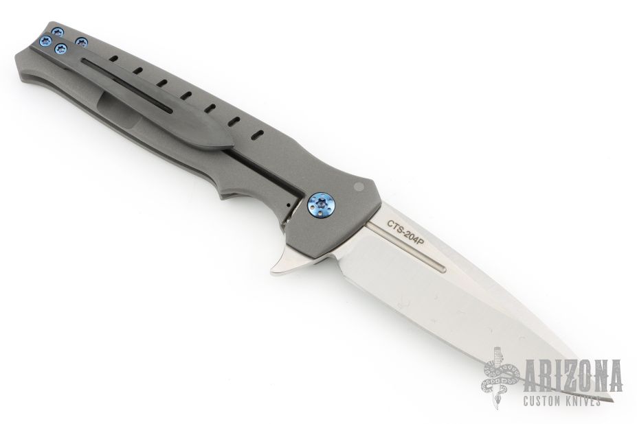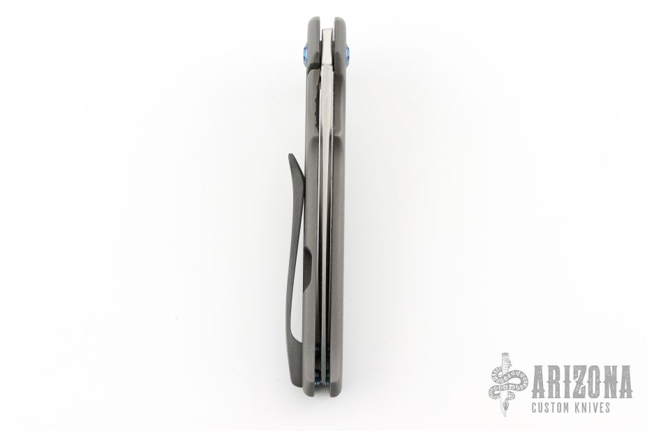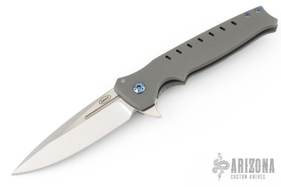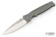 This Centron by Shane Sibert features a satin finished spear point blade with fullers and flipper. The handle has a bead blasted titanium frame with tip up Zirconium clip and anodized titanium hardware. Rides on bearings, nice detent, lockup and blade seating. Excellent condition.