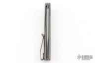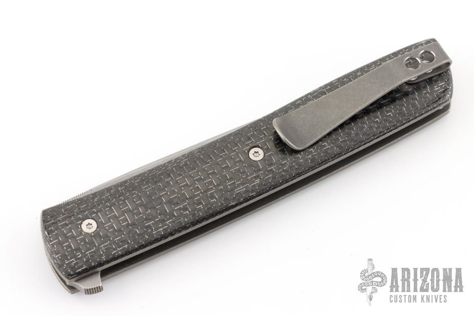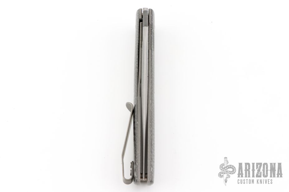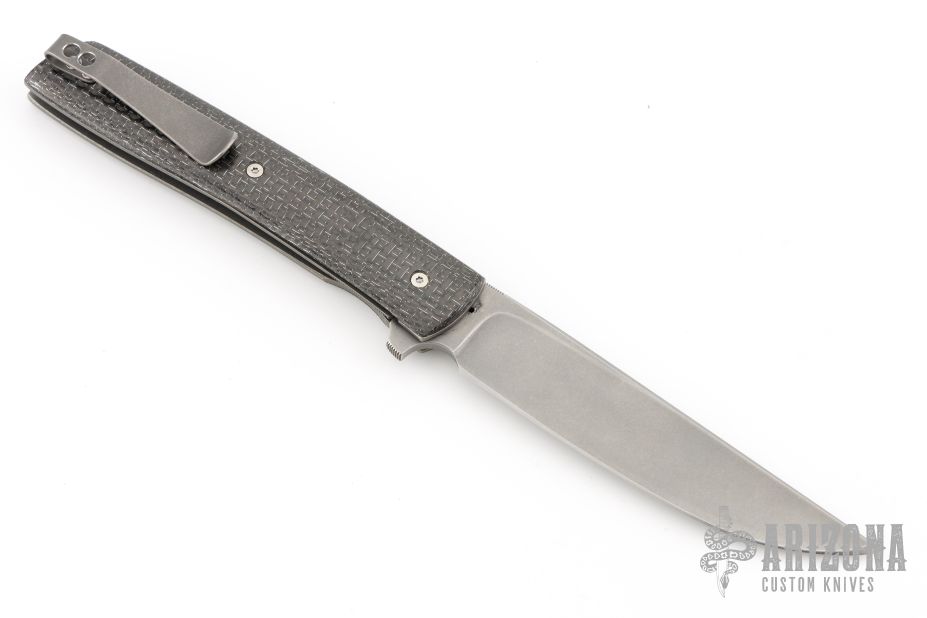This Urban Trapper flipper by Brad Zinker features a tumble finished blade with a notched flipper, .138" blade stock. The handle has silver lightning strike carbon fiber scales, tumbled titanium liners and tip up titanium clip. Nice detent, blade seating and lockup. Comes with a zippered case. Excellent condition.