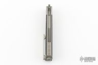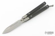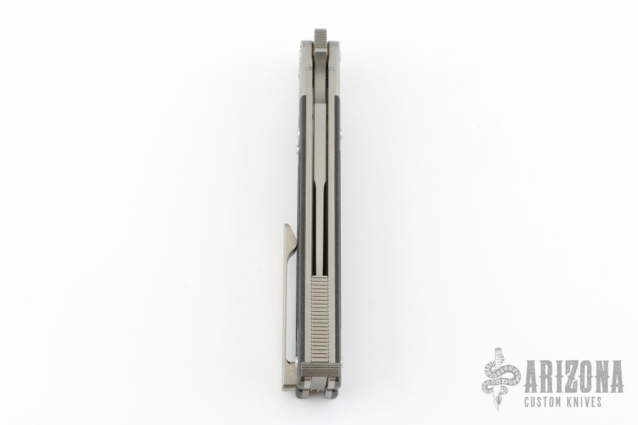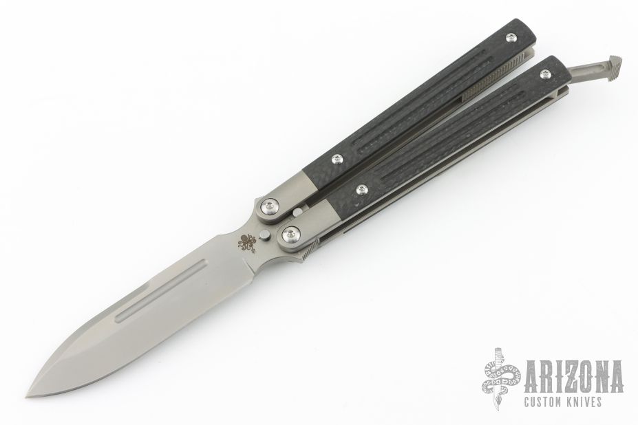 The SPD Invictus-Bali is a utility butterfly knife, featuring titanium billet handles with carbon fiber scales, a Böhler M390 blade, bronze bushing pivot, and a titanium spring latch. Additional details include jimping on the ears and back spacers, and a billet titanium pocket clip. Comes with a zippered case. Excellent condition.
