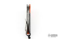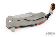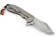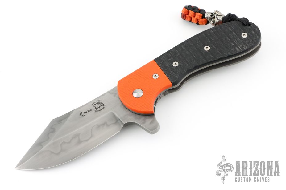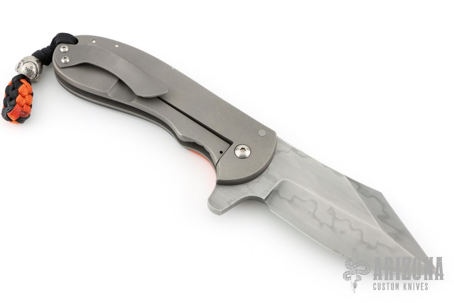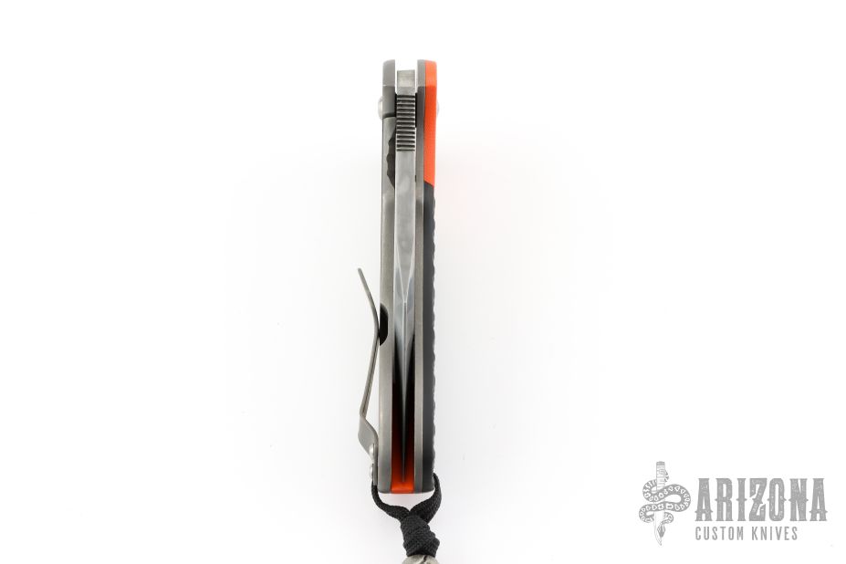 This Flipper from Michael Burch of Burchtree Bladeworks features a clip point blade with hamon and flipper. The handle is comprised of orange g10 bolsters and black milled G10 scales over bead blasted titanium liners, tip up clip and a notched orange G10 Backspacer. Excellent condition.